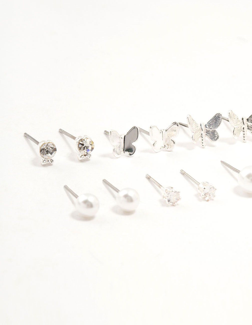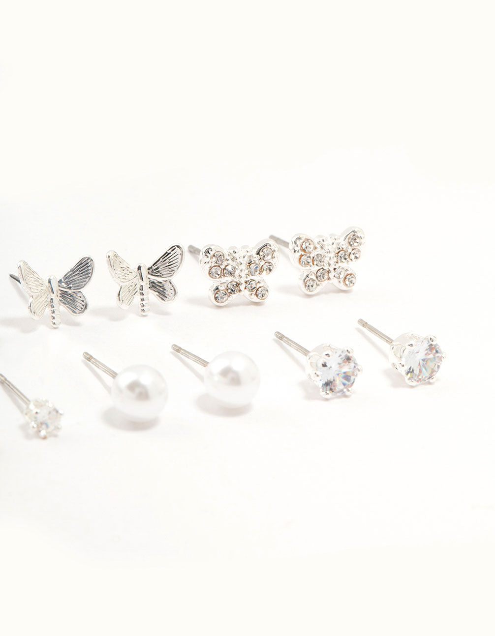 Silver Pearl Diamante Butterfly Earrings 8-Pack