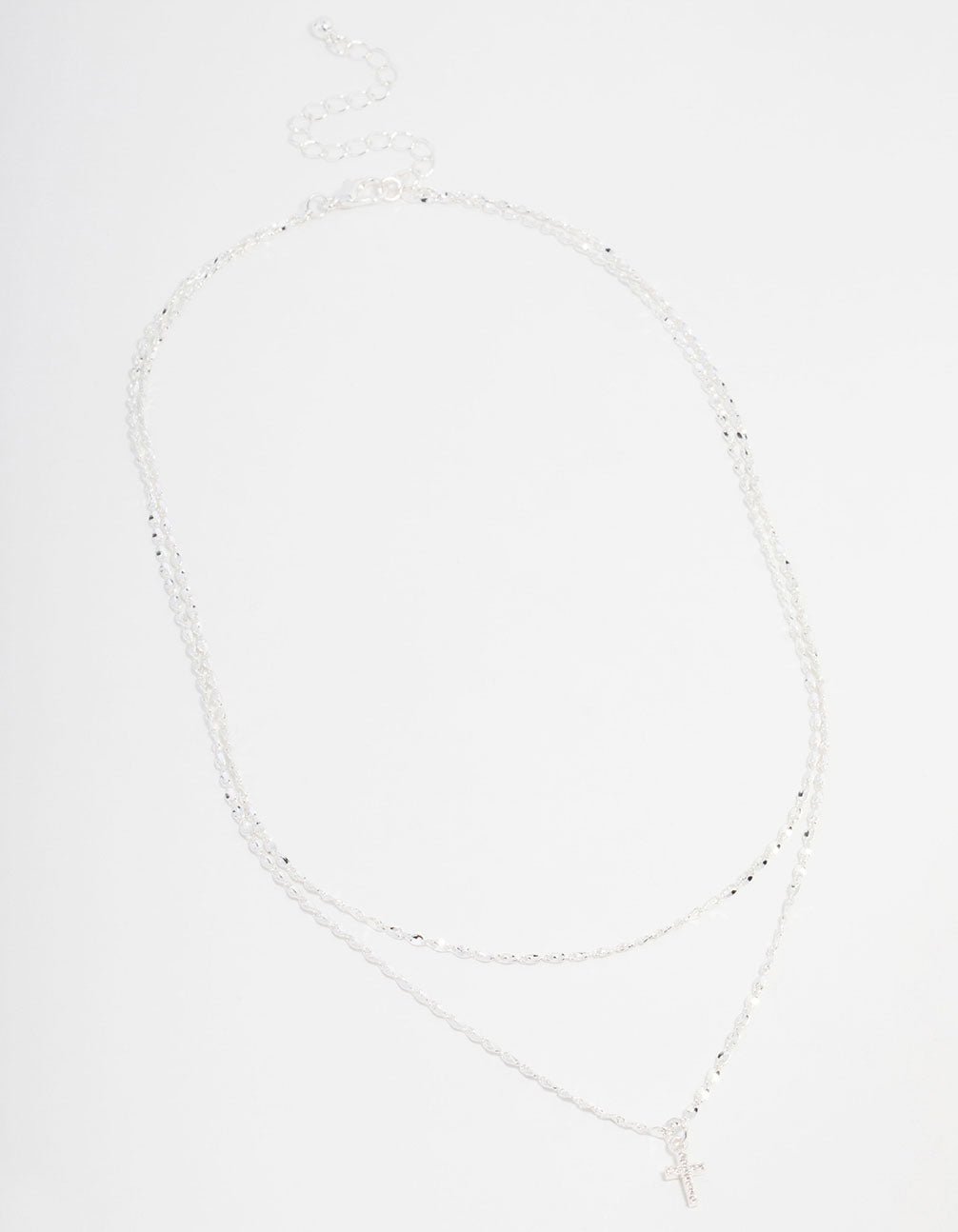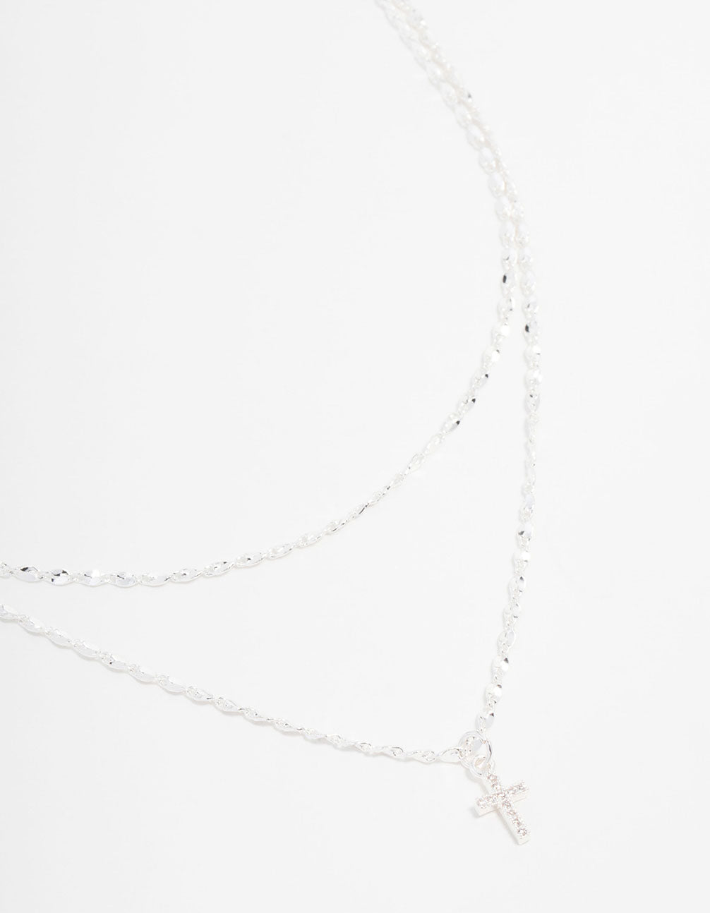 Elevate your style with this exquisite necklace set. Achieve an effortless layered look with two stunning silver-plated necklaces: one plain and one cross motif pendant encrusted with cubic zirconia crystals.