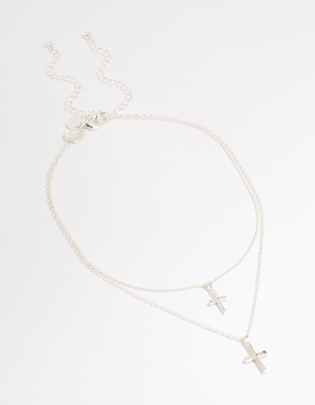 Silver Plated Cubic Zirconia & Plain Cross Layered Necklace Silver Plated Cubic Zirconia & Plain Cross Layered Necklace Silver Plated Cubic Zirconia & Plain Cross Layered Necklace