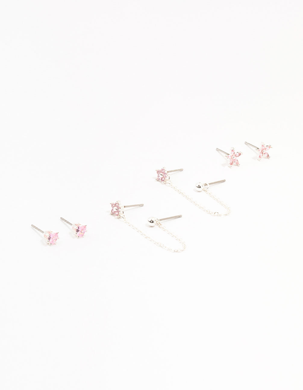 Silver Plated Brass Heart Flower Chain Earrings 3-Pack