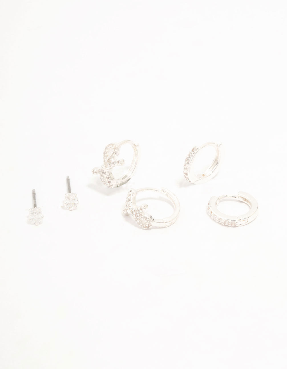 Silver Plated Pave Set Cubic Zirconia Bow Huggie & Stud Earrings 3-Pack