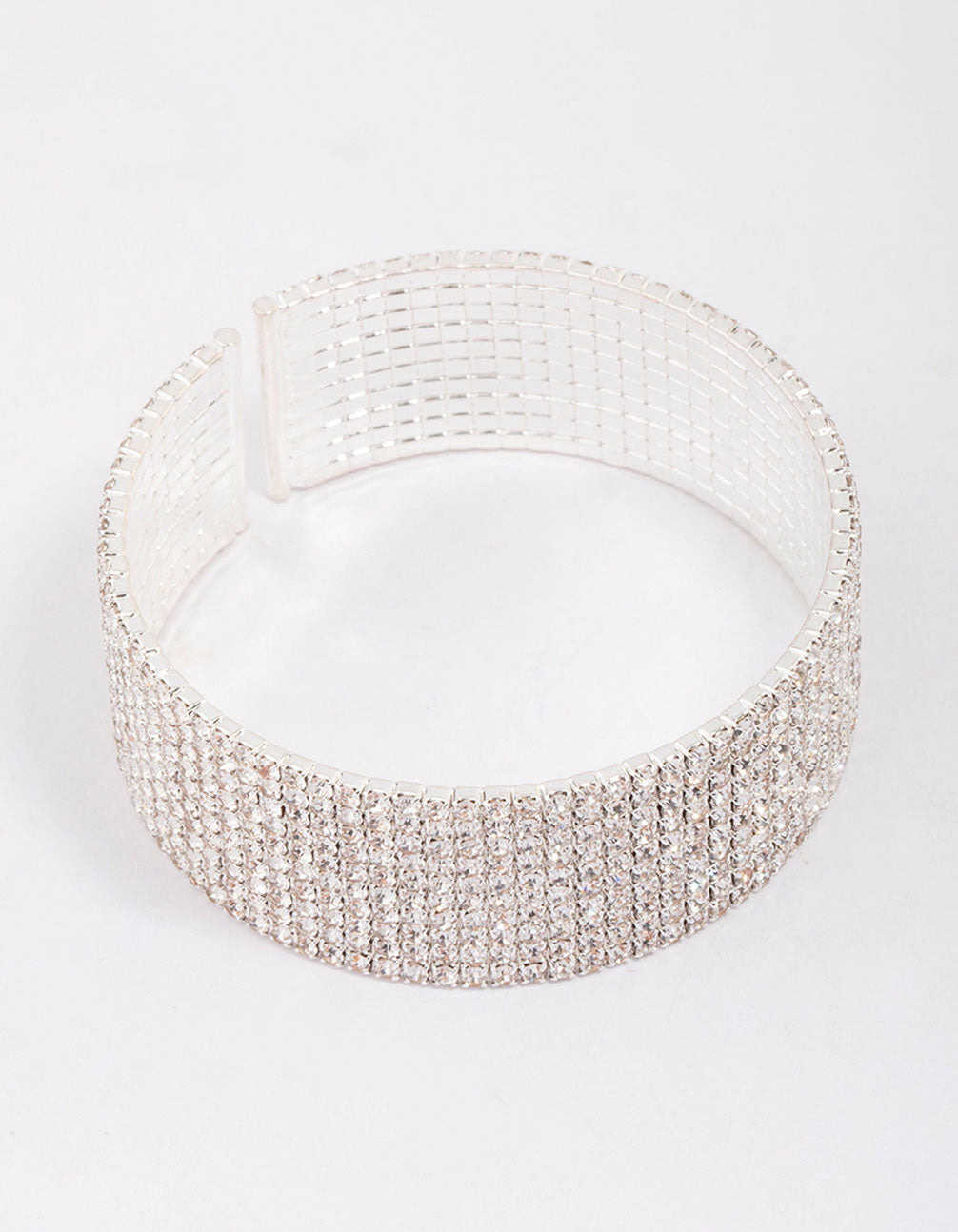 Elevate your outfit with this stunning, silver plated bracelet. This unique bracelet features a wide silhouette, adorned with delicate diamantes for a glamorous finish. Perfect for adding interest to an evening look!