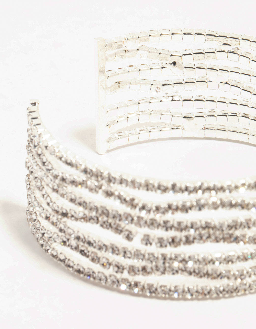 Upgrade your wrist game with this captivating Silver Straight & Wave Diamante Wrist Cuff. This diamante-encrusted accessory blends sleek lines and mesmerizing waves, creating a one-of-a-kind piece that commands attention.