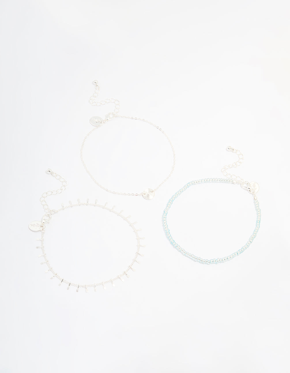 Silver Turquoise Beaded & Spiral Circle Anklets 3-Pack
