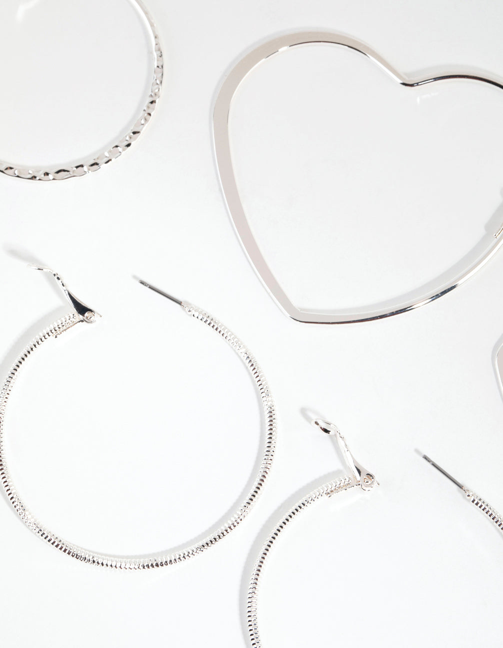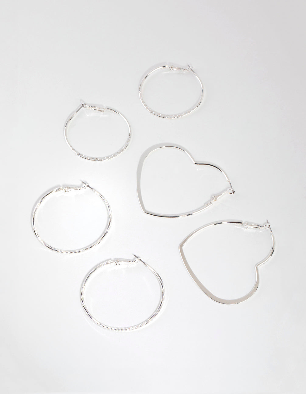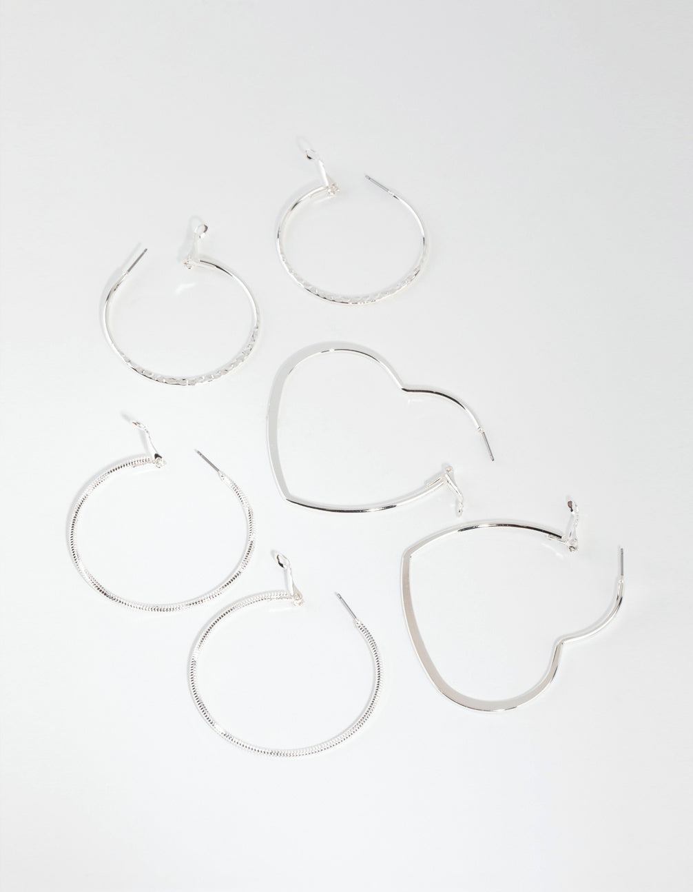 Almost any outfit can be elevated with a pair of hoop earrings! This pack includes three silver-toned hoops, each with a different design.