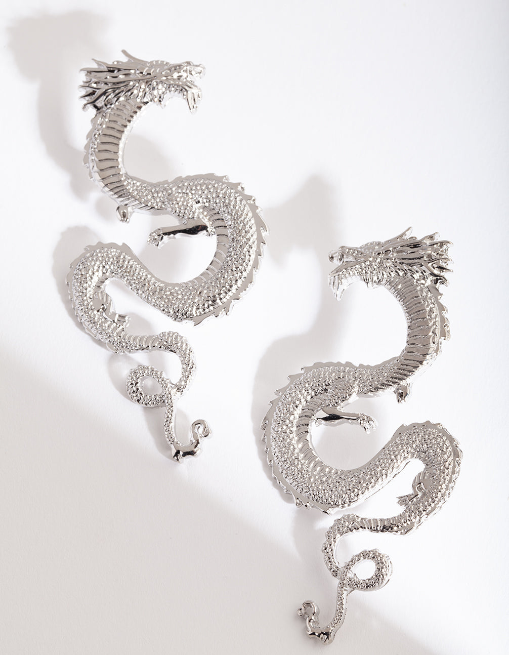 Statement earrings have become the easiest way to switch up any wardrobe. Conversation-starting styles mean that a new pair of earrings replaces the need for a new dress. These earrings boast a silver-toned textured dragon design.