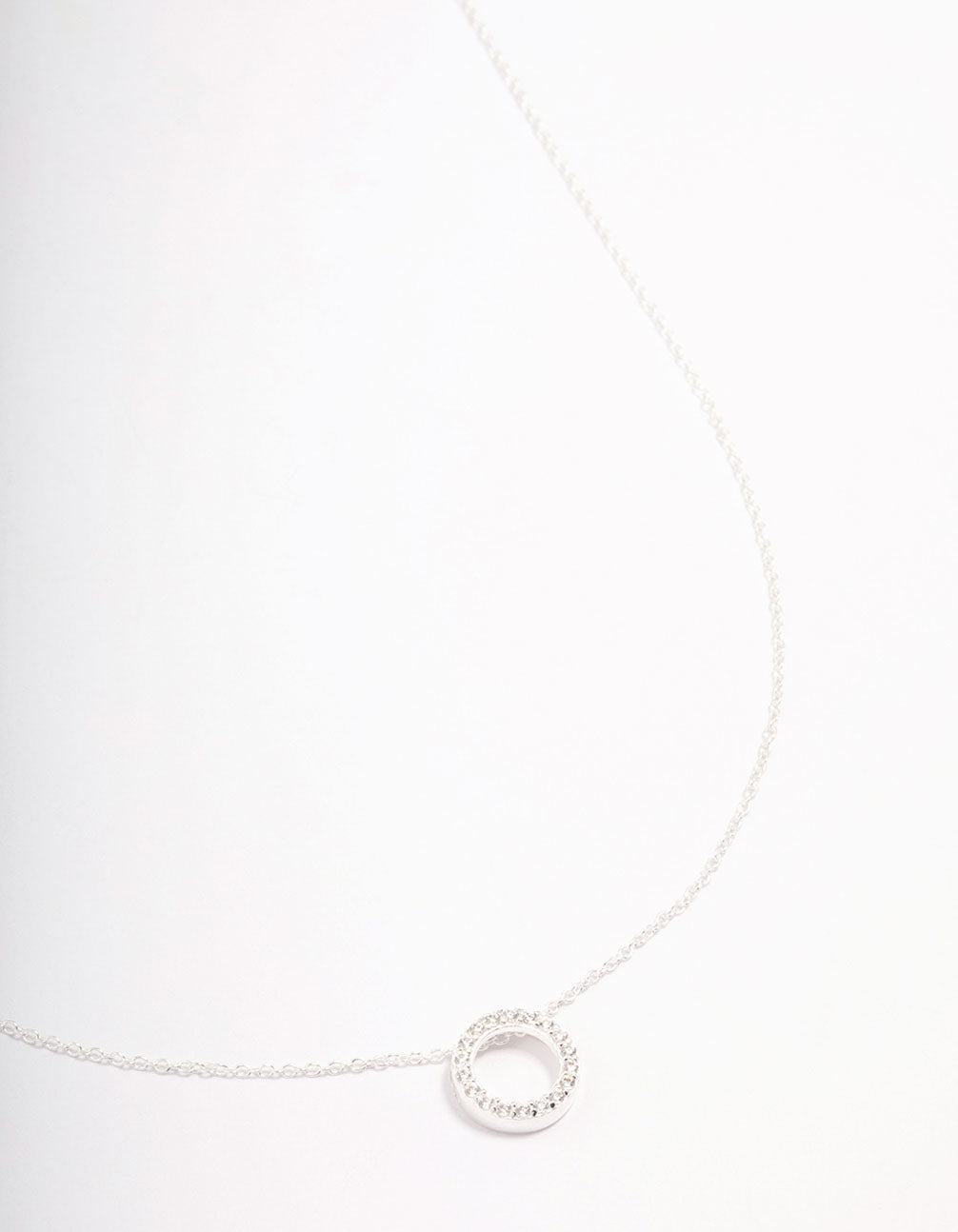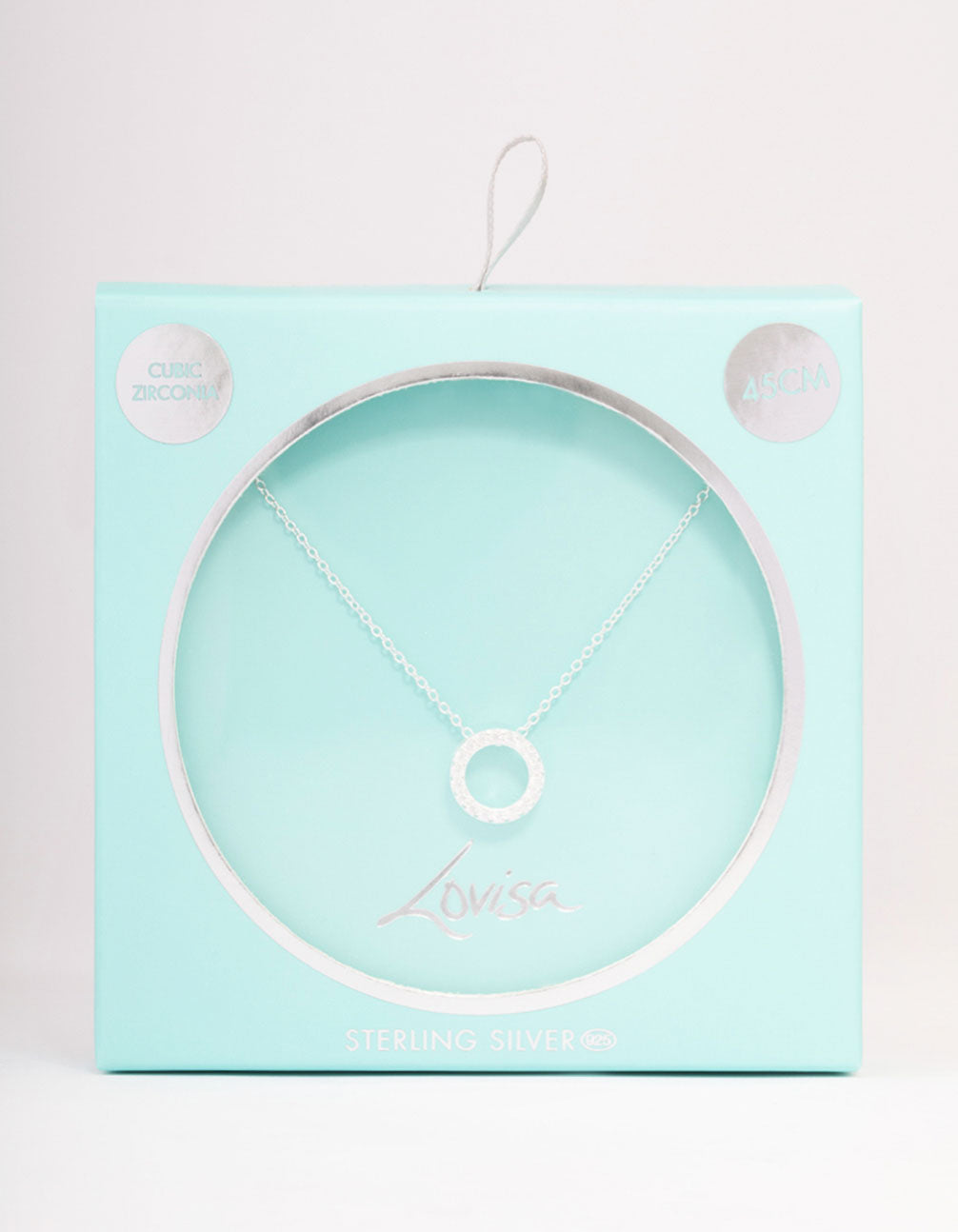 This gift box contains a signature sterling silver pendant necklace, adorned with a simple diamante-encrusted circle pendant for a modern feel.