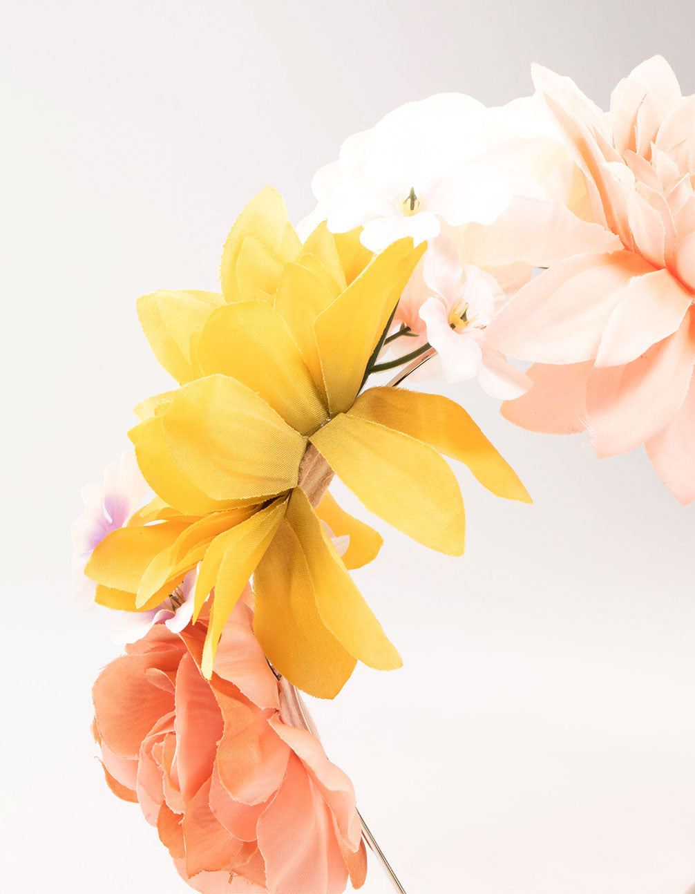 Get a head start on the latest in hair accessories with this pink, yellow and white large bouquet flower headband.