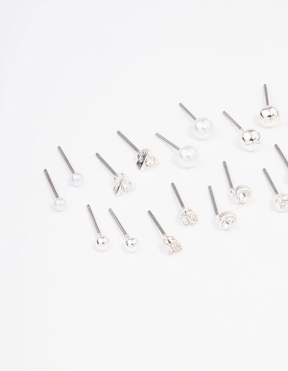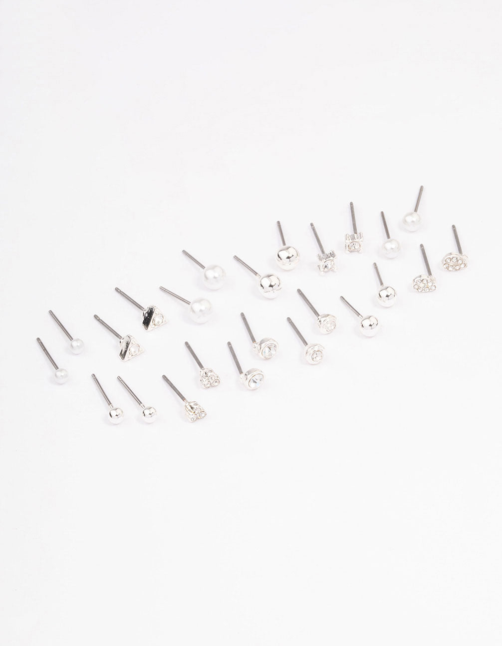 - Customise your stack with this pack of twelve earrings. This comprehensive pack features a collection of silver diamante stud and hoop earrings — perfect for versatile styling.