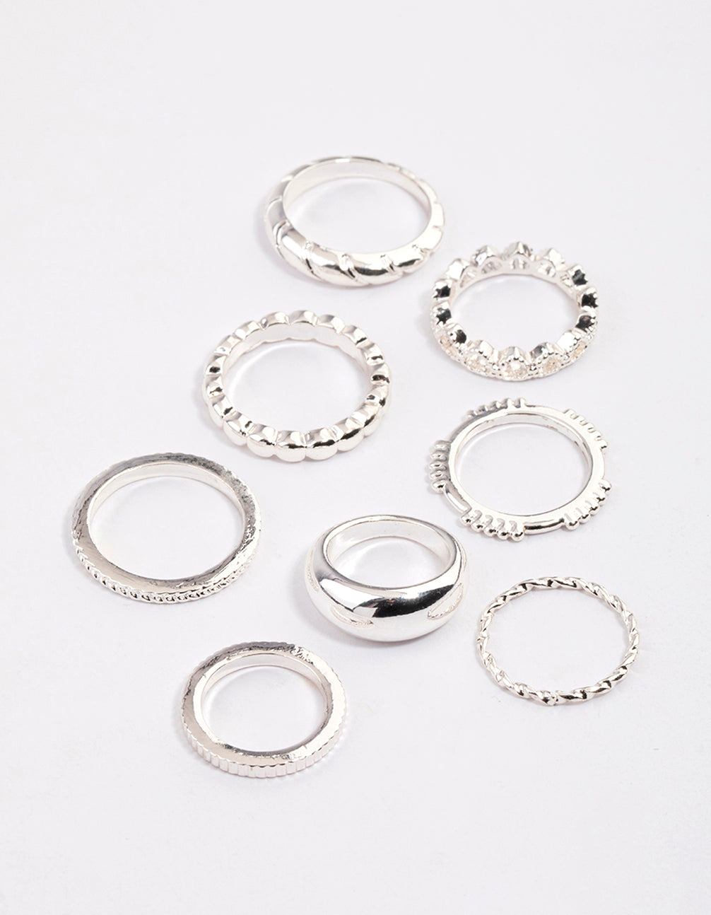 - This ring pack contains a set of dainty, silver rings with twisted textures and heart motifs for a timeless look.