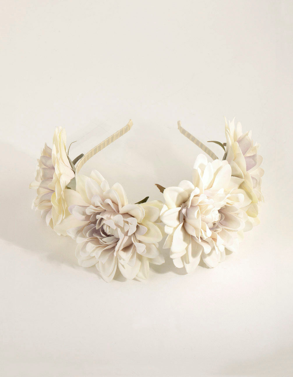 For formal hair pieces with natural undertones look to our floral crowns. This beautiful headband features an ivory Alice band design. It's decorated with stunning fabric chrysanthemum flowers in a statement size that's sure to impress. Wear this piece for a formal look with an organic edge.