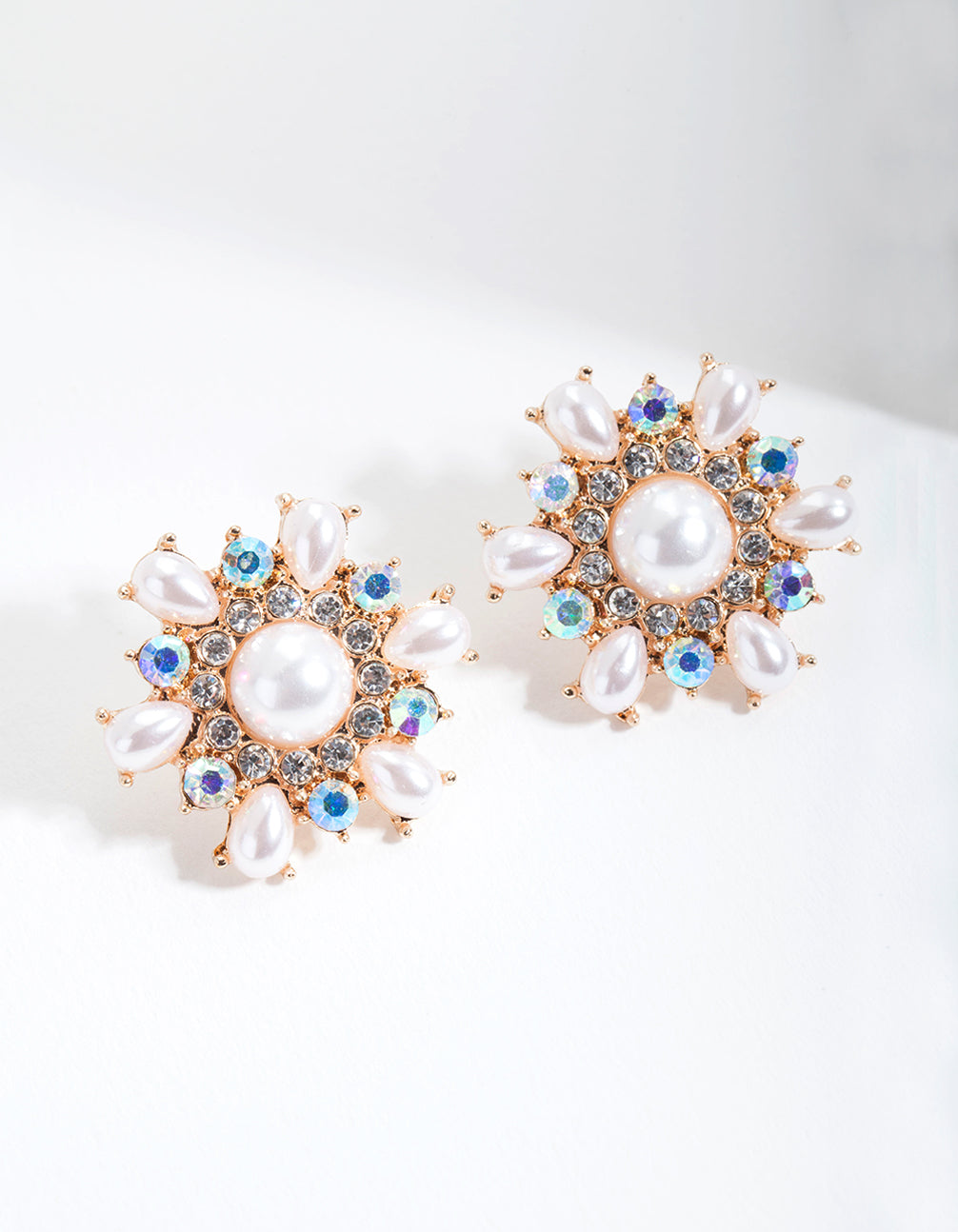 Gold Pearl Diamante Flower Stud Earrings