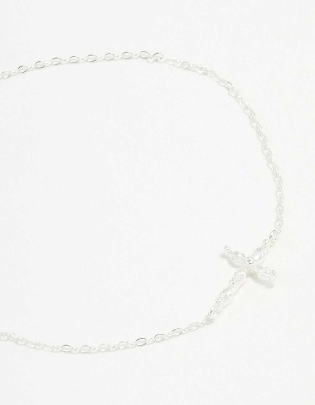 This sterling silver bracelet features a horizontal cross design encrusted with cubic zirconia crystals, exuding modern sophistication and versatile elegance.