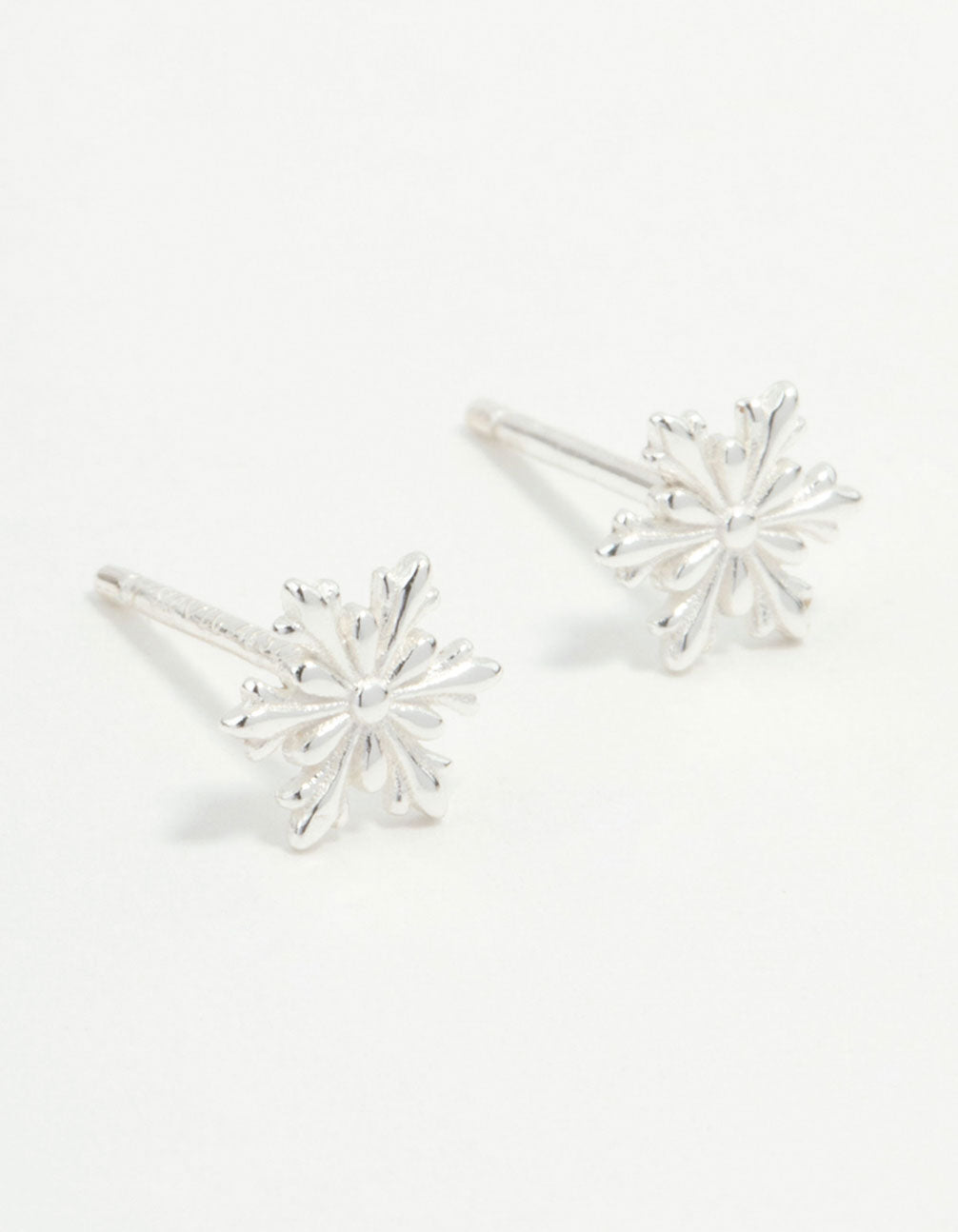 Get the winter wonderland look with these sterling silver stud earrings featuring a snowflake design. Perfect for adding icy elegance to any look and keeping you festive all year-round.