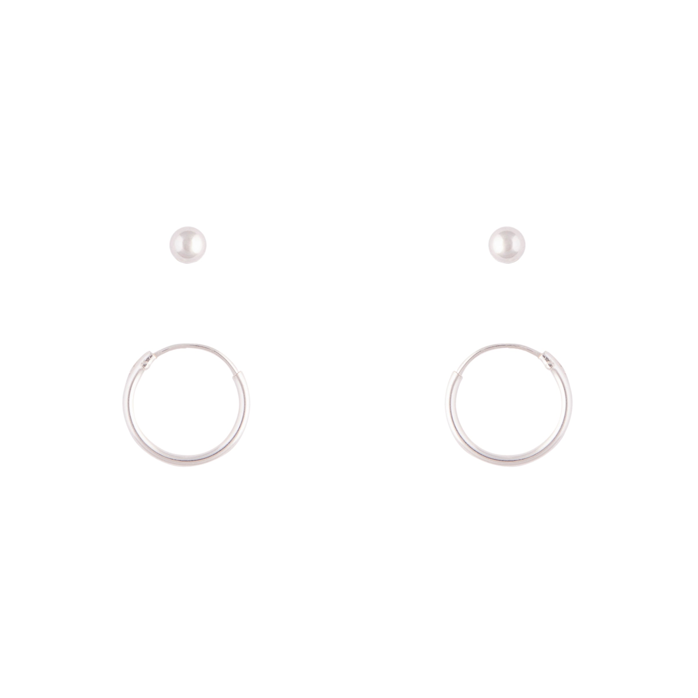 A duet of sterling silver earrings in polished circle and sleeper designs.