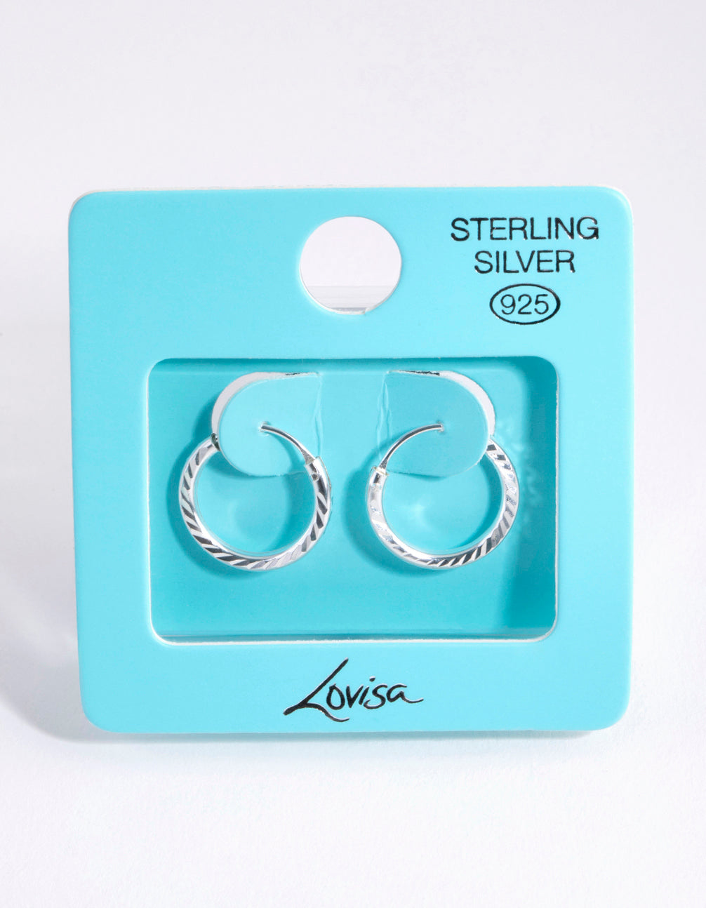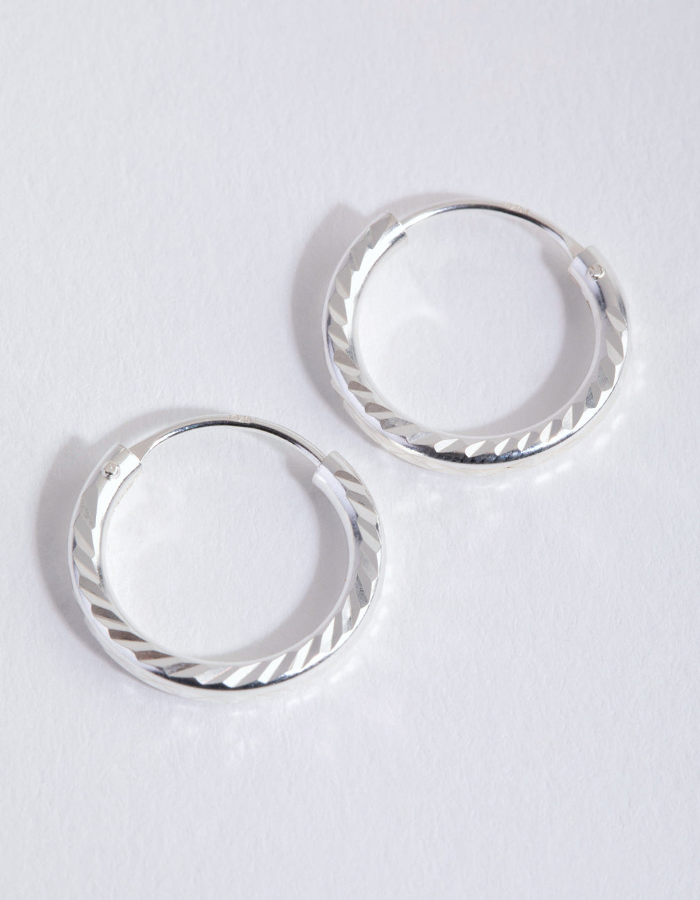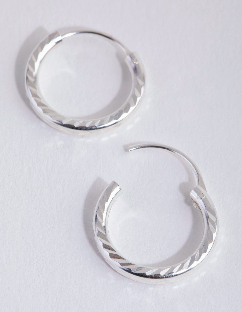 A pair of sterling silver hoop earrings with a diamond cut finish.