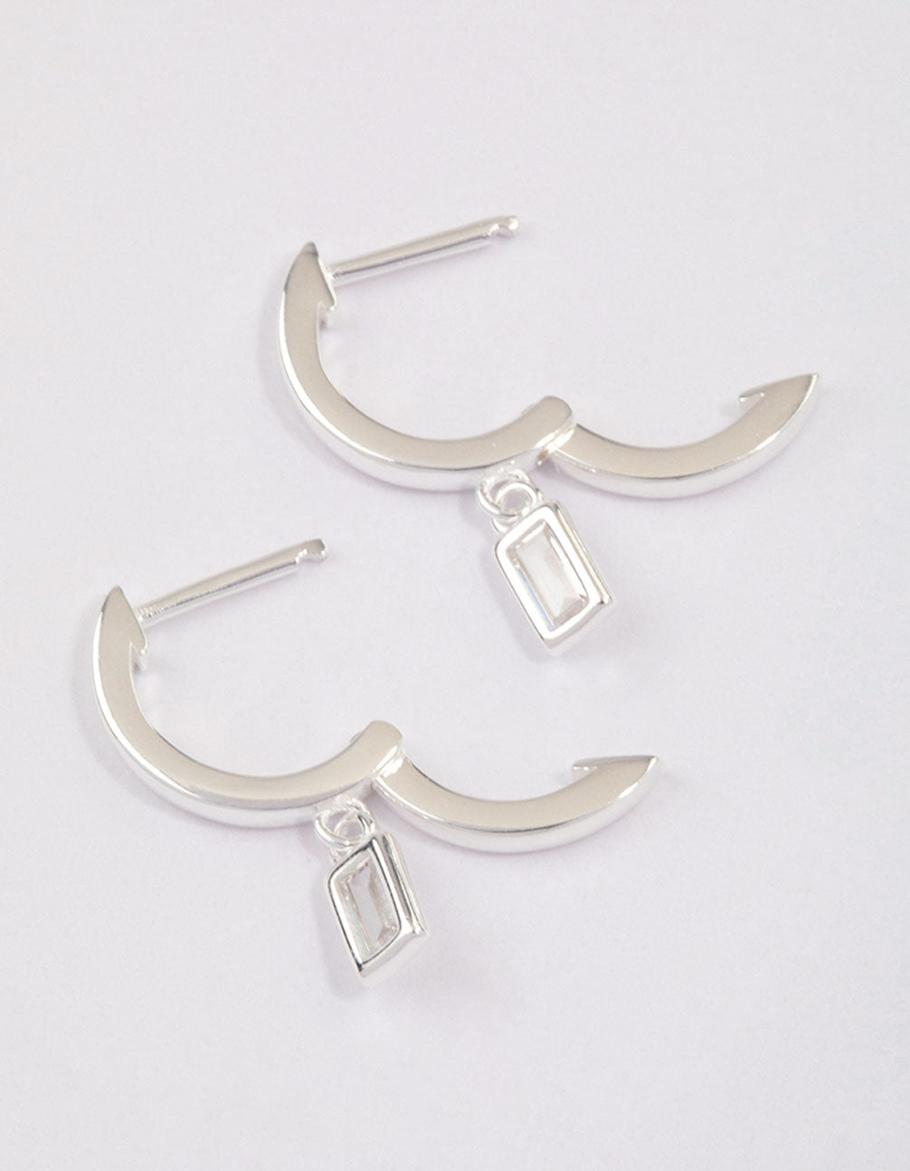 - Style these Sterling Silver Cubic Zirconia Baguette Drop Huggie Earrings with a set of simple stud earrings for a curated finish.