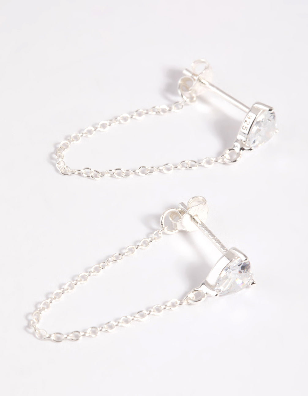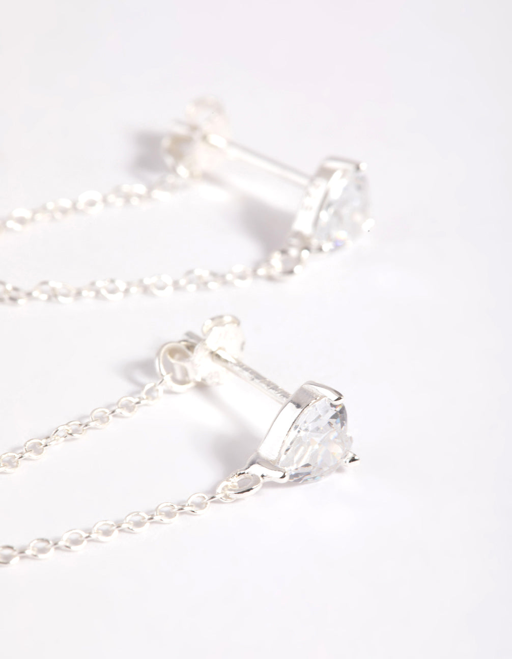 Sterling Silver Cubic Zirconia Heart Chain Stud Earrings
