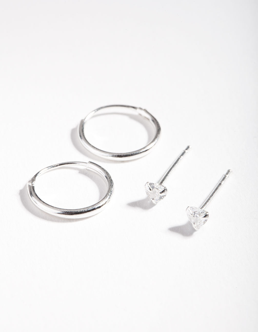 Attract light and shine with classic sterling silver jewellery embellished with cubic zirconia stones. These flawless stones are the perfect way to bring that added bit of sparkle to your collection. This pack features a duet of classic styles with a pair of polished huggie hoop earrings and a pair of love heart shaped studs.