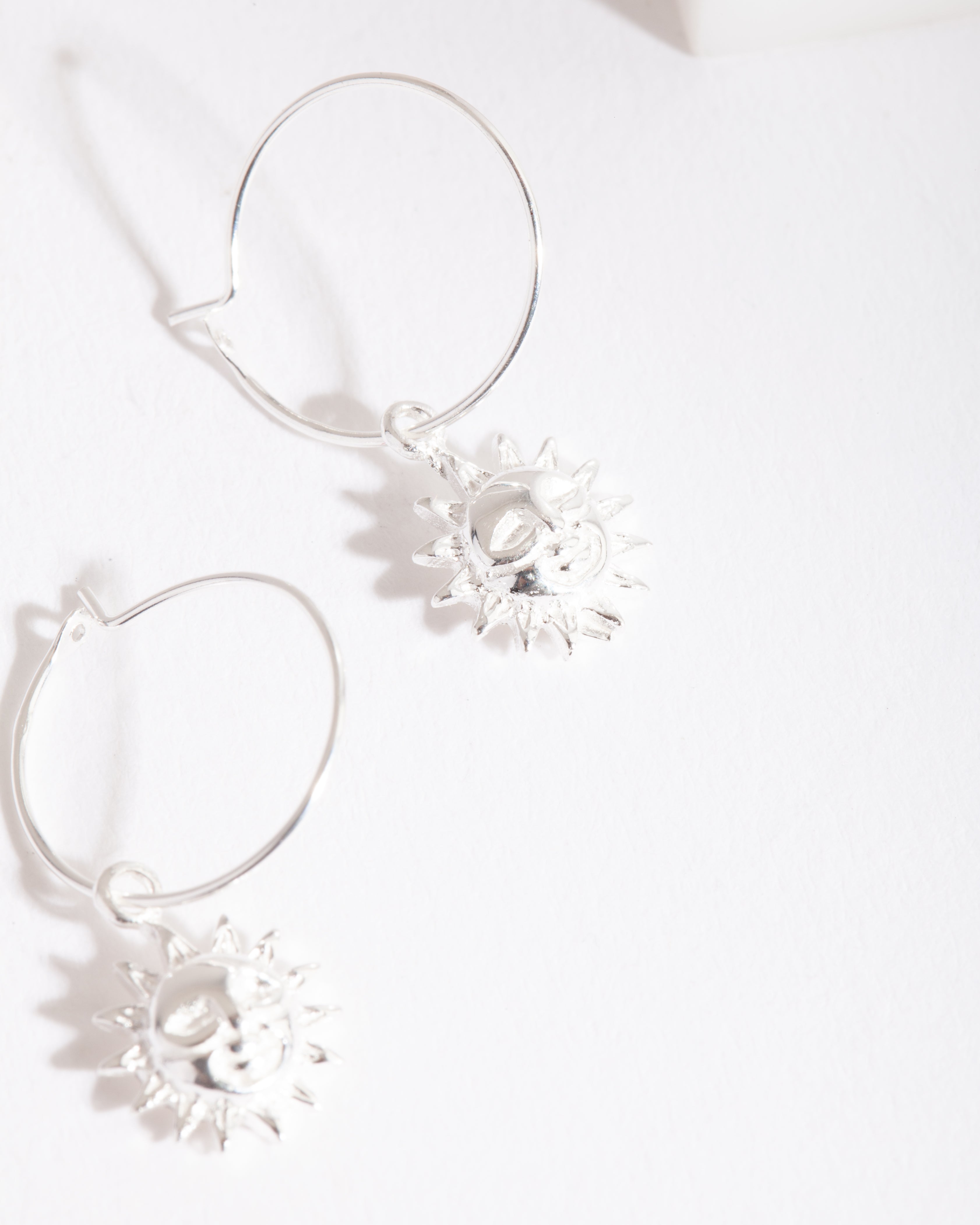 Sterling silver styles are a great way to round out your collection. These earrings feature a sun charm hoop design.