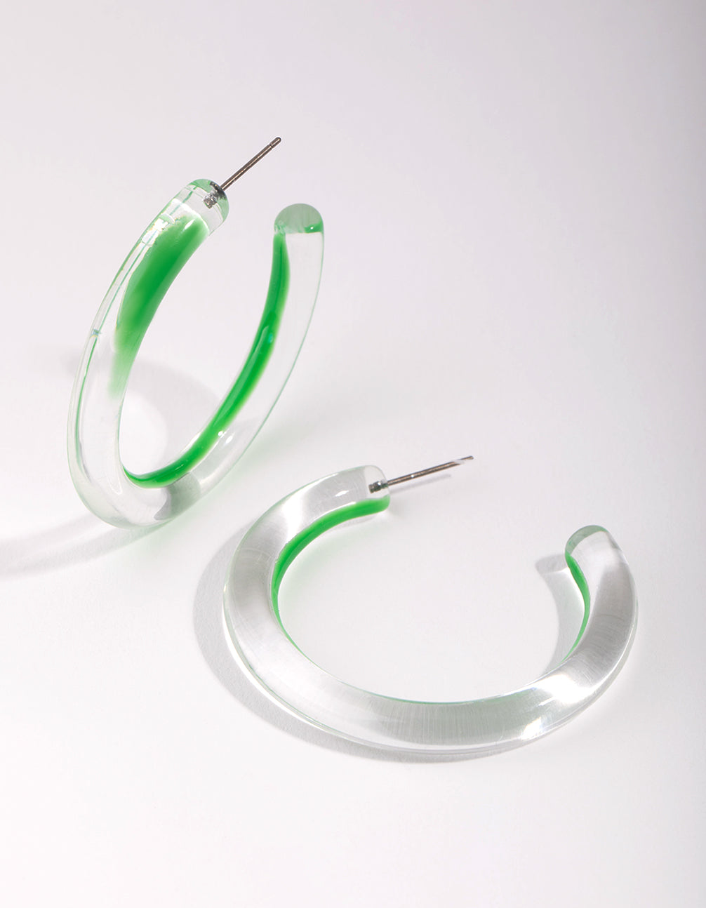 Make a statement with bright, funky styles that'll have you feel like you're on vacation year round. These gorgeous hoop earrings are acrylic, and from the front appear to be a vivid green but from profile reveal themselves to be clear with a subtle green detail. Wear them to trick the eyes and wait for the compliments to roll in!