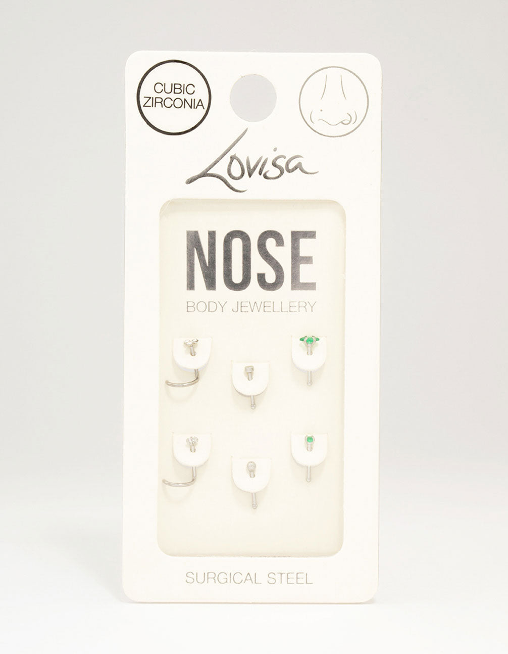 Customise your look with our selection of premium, genuine surgical steel piercing jewellery. This piercing pack contains six individual nose piercings, each adorned with emerald and crystal-coloured diamantes for a touch of glamour.
