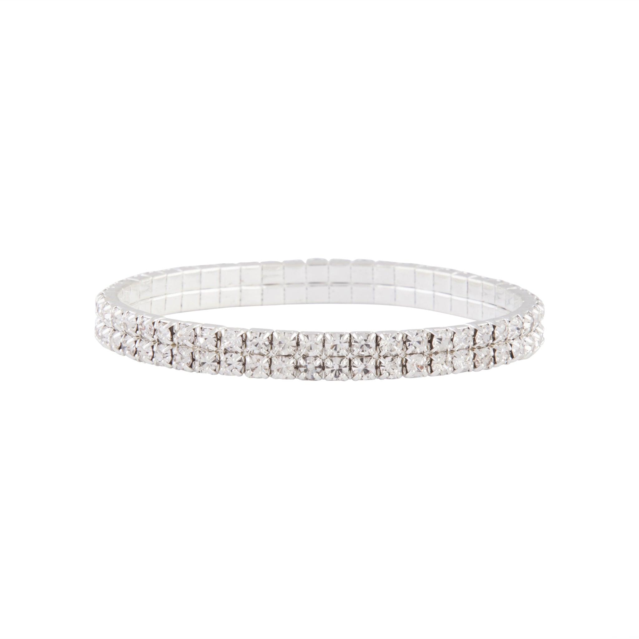 This bracelet features silver tones with a gleaming double row of diamantes to create the perfect formal look.
