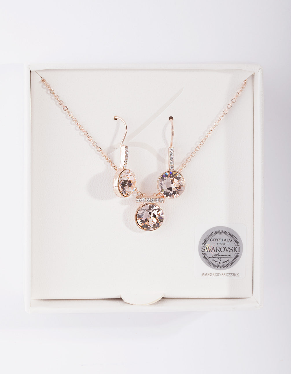 Pretty in pink! This lovely set is rose-gold toned, and features a pendant necklace with matching drop earrings. The stones included are diamond simulants: crystals cut to closely replicate true diamonds. Wear this set and shine!