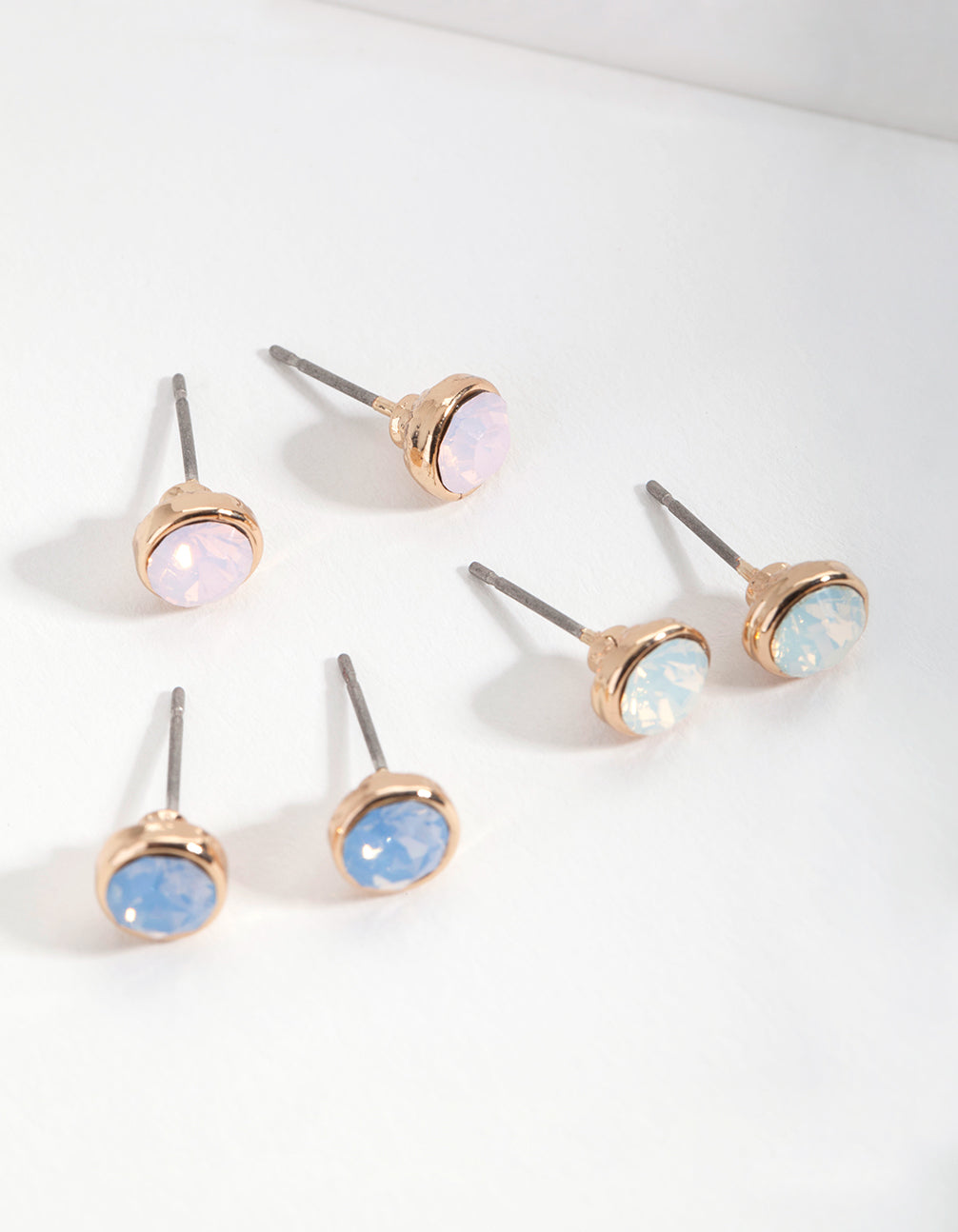 This set has been made using diamond simulants, which are crystals that have been cut with more facets than a standard crystal for maximum sparkle! This trio features blush, white and cerulean toned stones on a gold-toned setting.