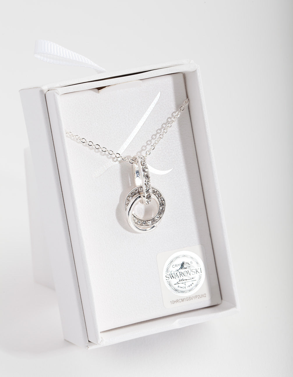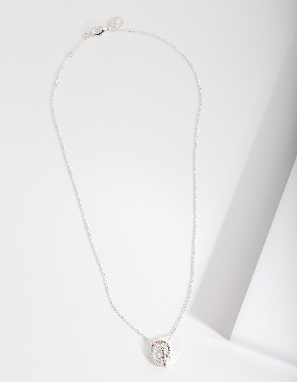 Add a touch of luxury with this eye-catching necklace! It's silver toned, and features an intertwined circle design. It boasts diamond simulant embellishments, which shine with the brilliance and facets of true diamonds.