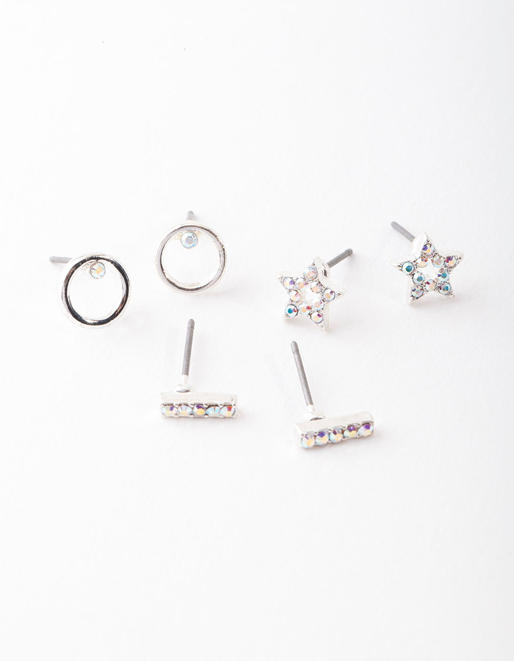 Add some extra sparkle to your collection with diamond-simulant embellished styles. This pack of earrings features three pairs of studs, each with a different style. Designs include crystal-embellished bars, circles and stars.