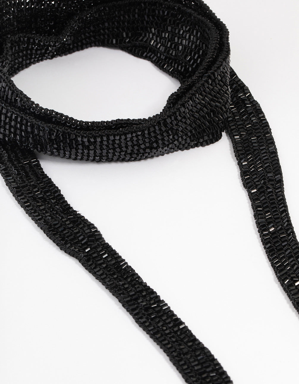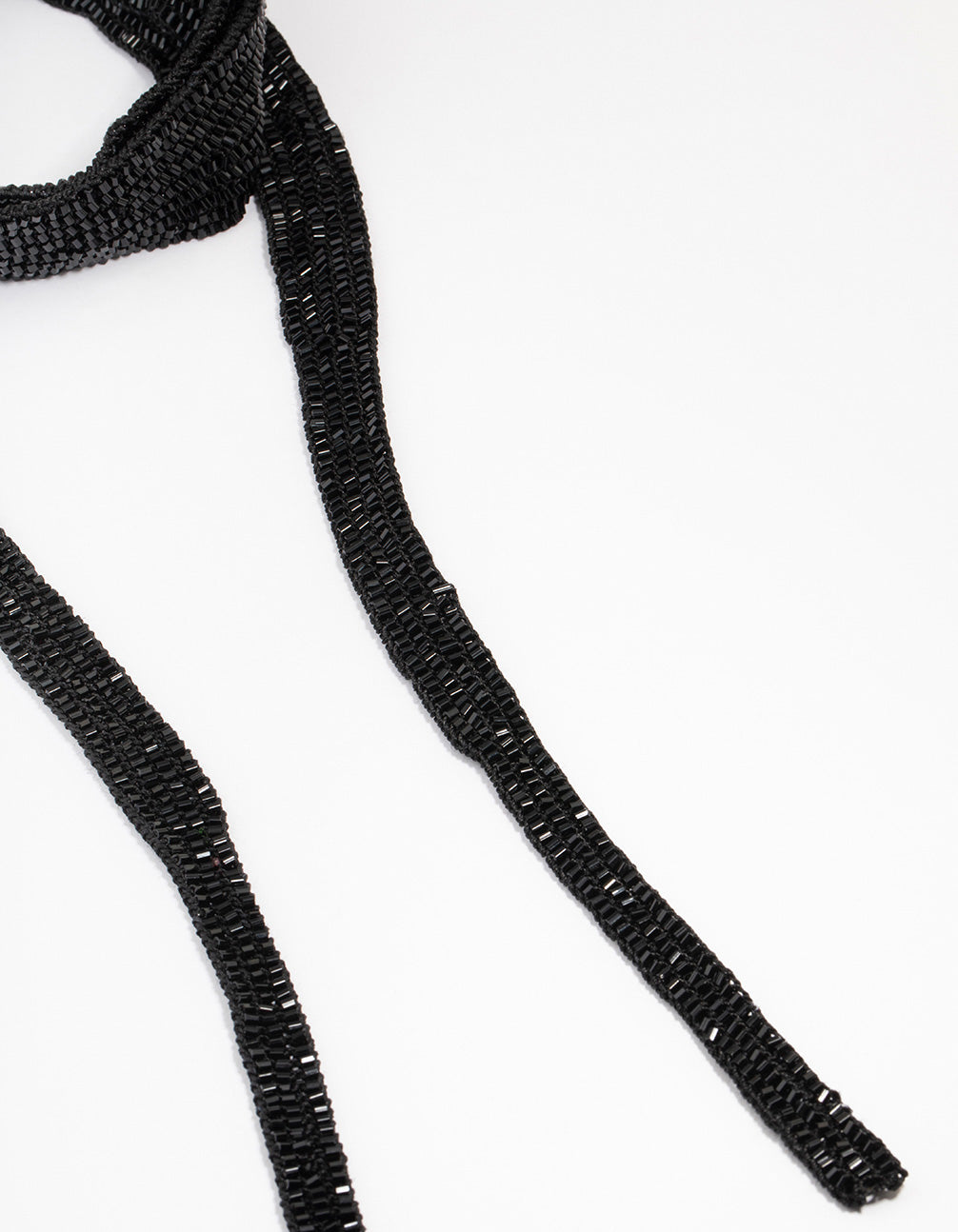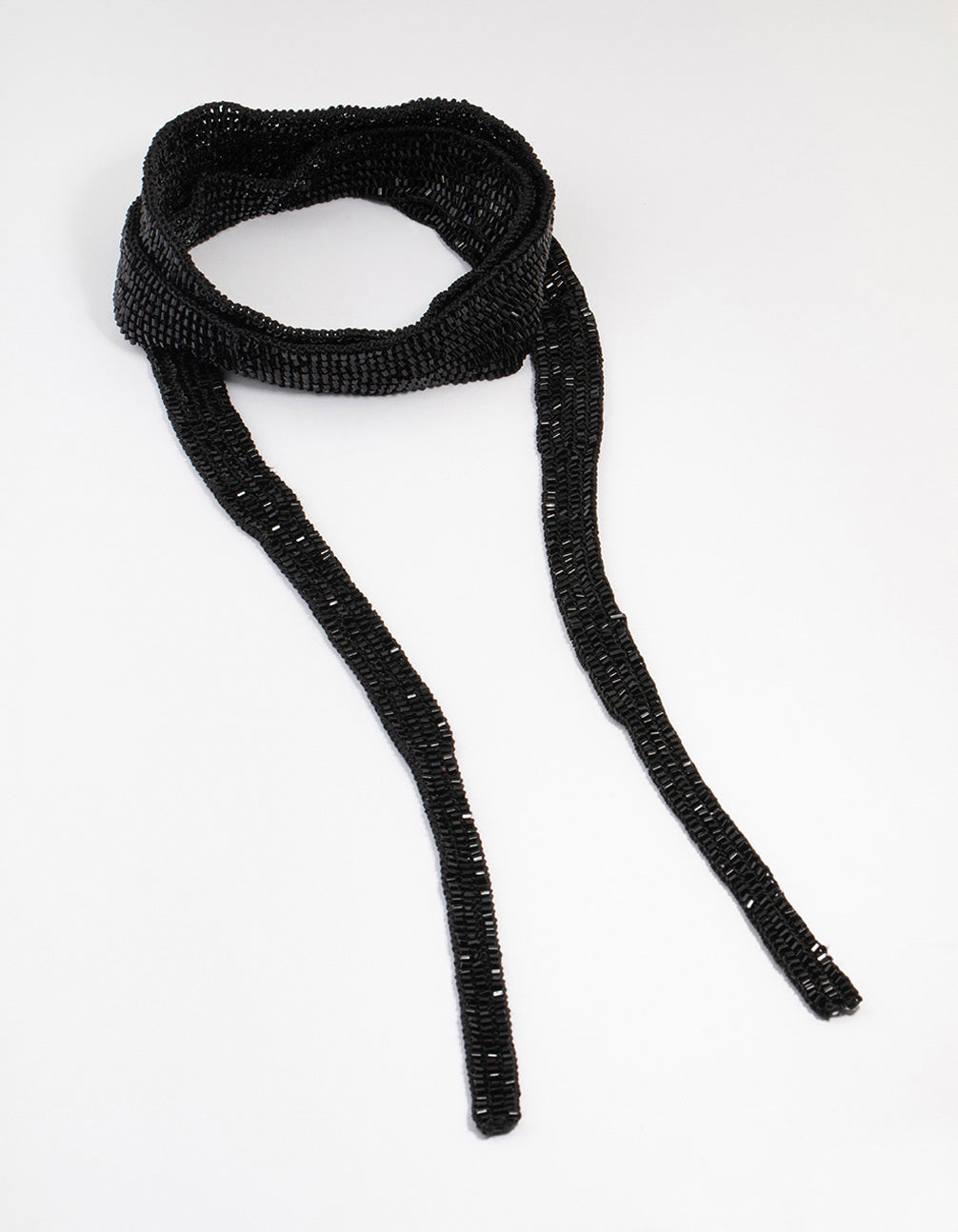 Jazz up your winter style with this black Thin Glass Beaded Scarf! Made of translucent glass beads on elastic thread. Wrap it around your neck, hair, or wrist to add a unique twist. Perfect with your fave LBD or as a unique hair accessory.