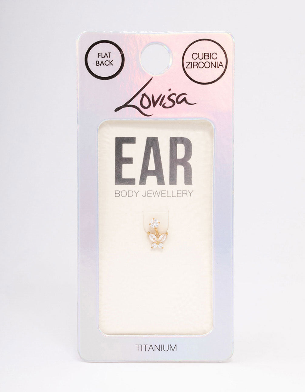 Gold Plated Titanium Cubic Zirconia Butterfly Drop Flat Back