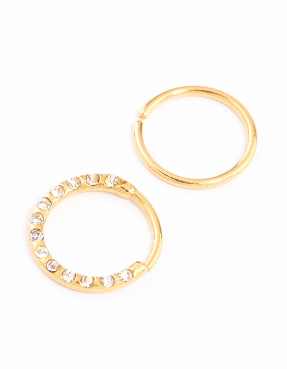 - This Gold Plated Titanium Cubic Zirconia Textured Nose Ring Pack contains two individual nose piercings, embellished with delicate diamantes for added shine.