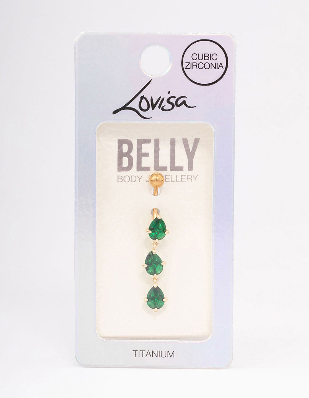 - This Gold Plated Titanium Triple Pear Drop Belly Ring is plated with gold and features pear-shaped crystals for a touch of bling.