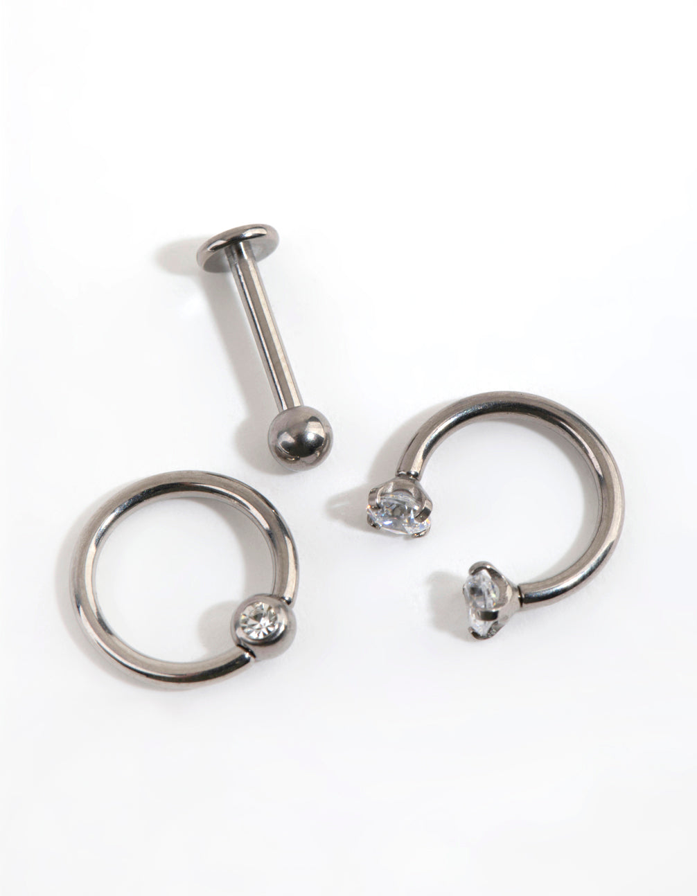 Express your individuality with Lovisa body jewellery! This earring pack is made with titanium, which is gentle on skin. It includes a horse shoe earring, a flat back stud and a clicker ring. Each piece measures 16G/1.2mm.