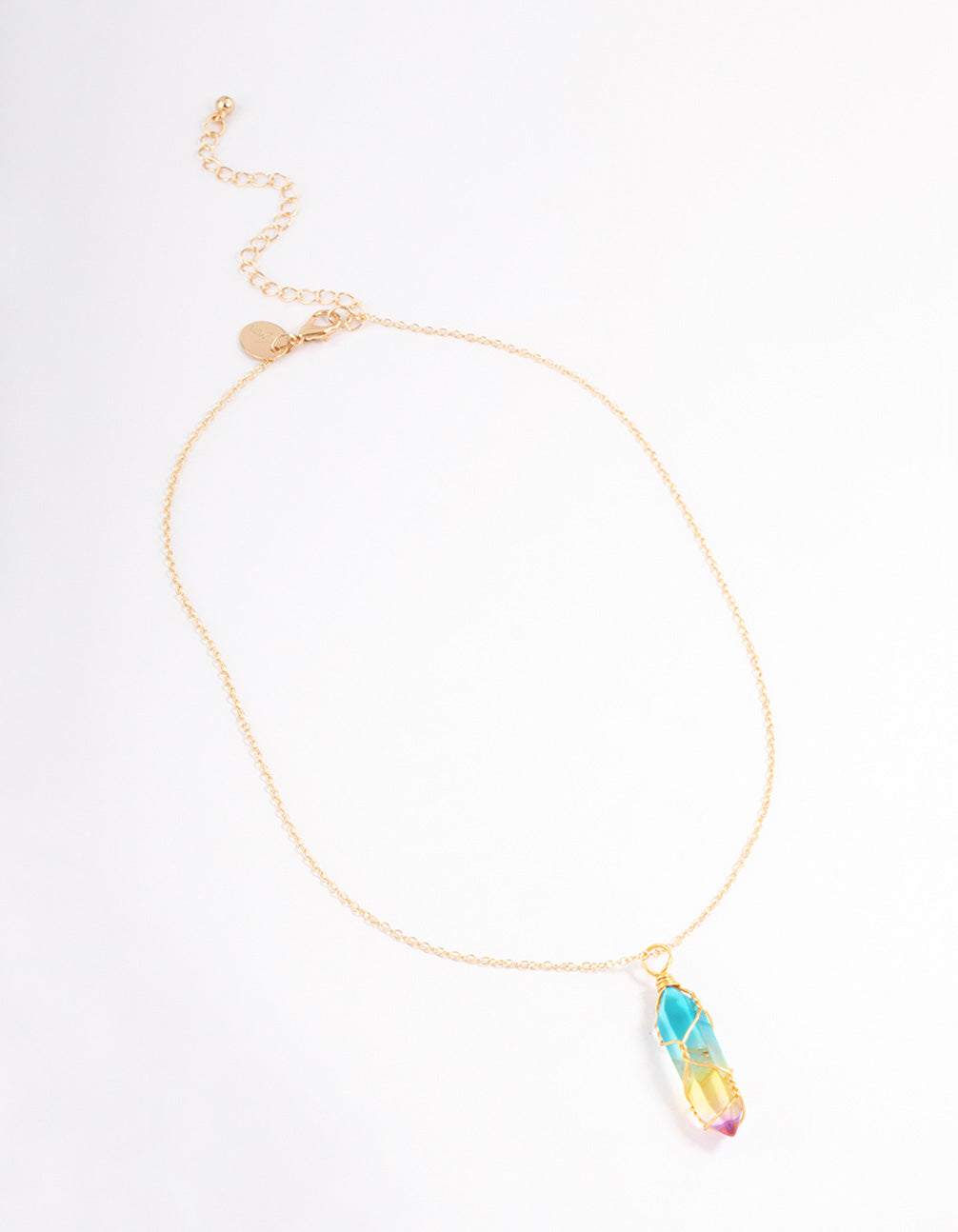 This pendant necklace features a shard-shaped, rainbow coloured crystal with a gold, intricate casing for added detail.
