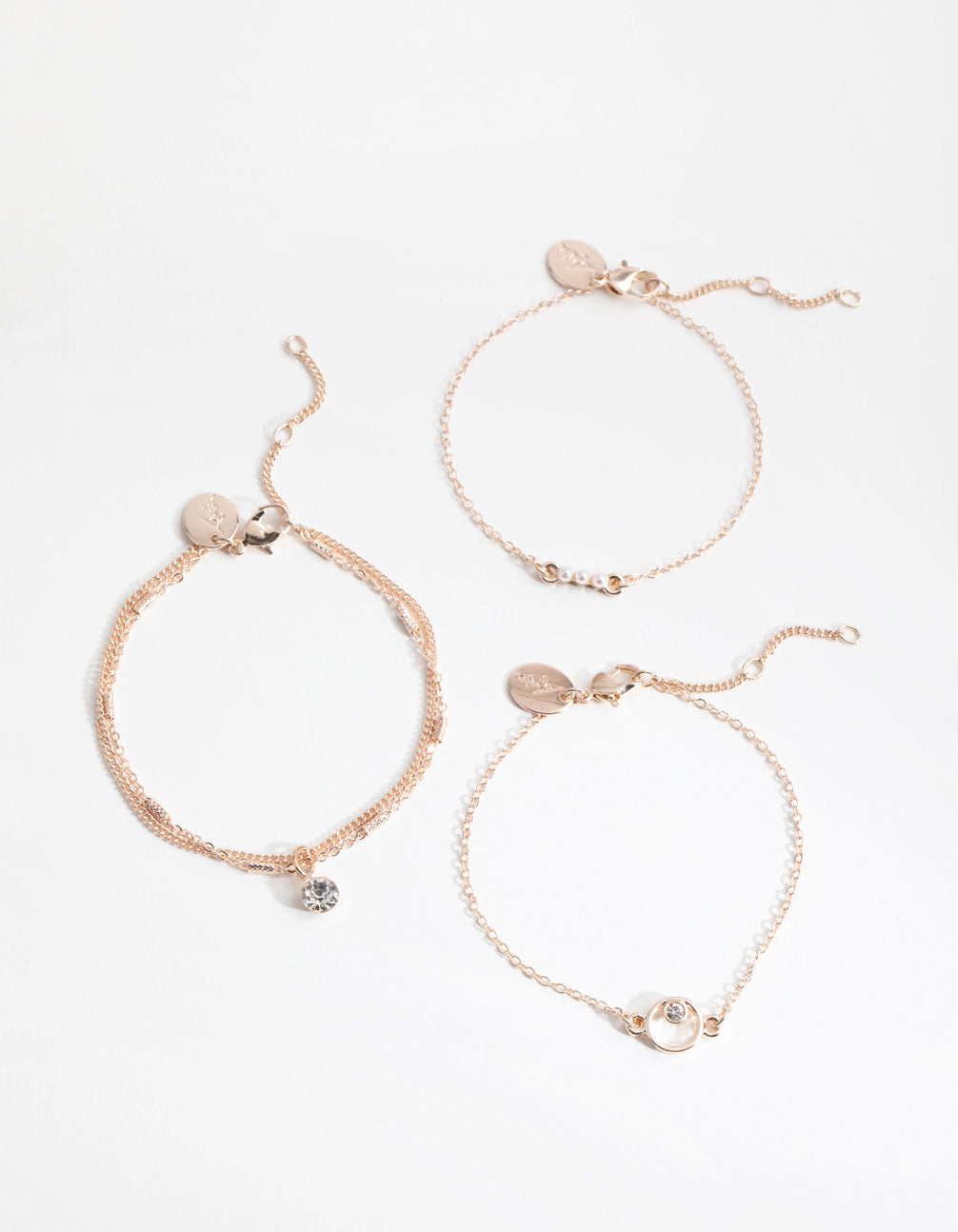Delicate chains are versatile pieces that can easily be dressed up or down depending on the occasion. This bracelet pack includes three fine rose-gold toned chains with diamante details. Wear them on their own for an elegant look, or stack them with others for maximum impact.