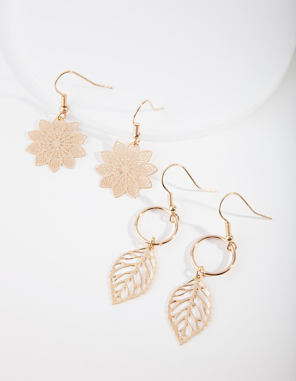 Update your collection with a pair of fashion earrings. This pair features a gold-toned layered design with a leaf motif. Style with a bold lip and wear on a night out!