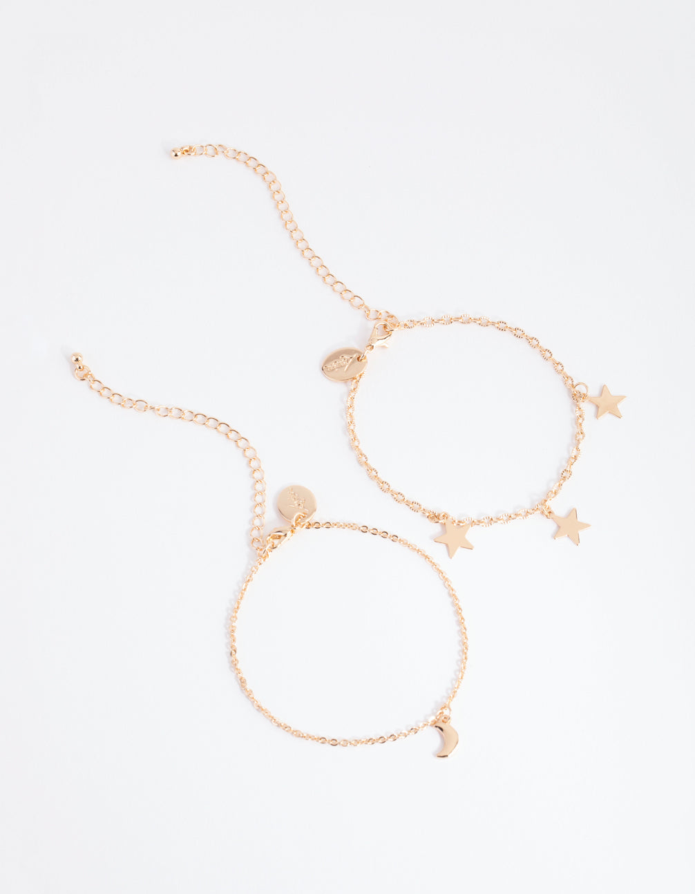 This bracelet pack is perfect for layering. It features two gold-toned bracelets, one with a row of star charms and the other with a single moon motif.