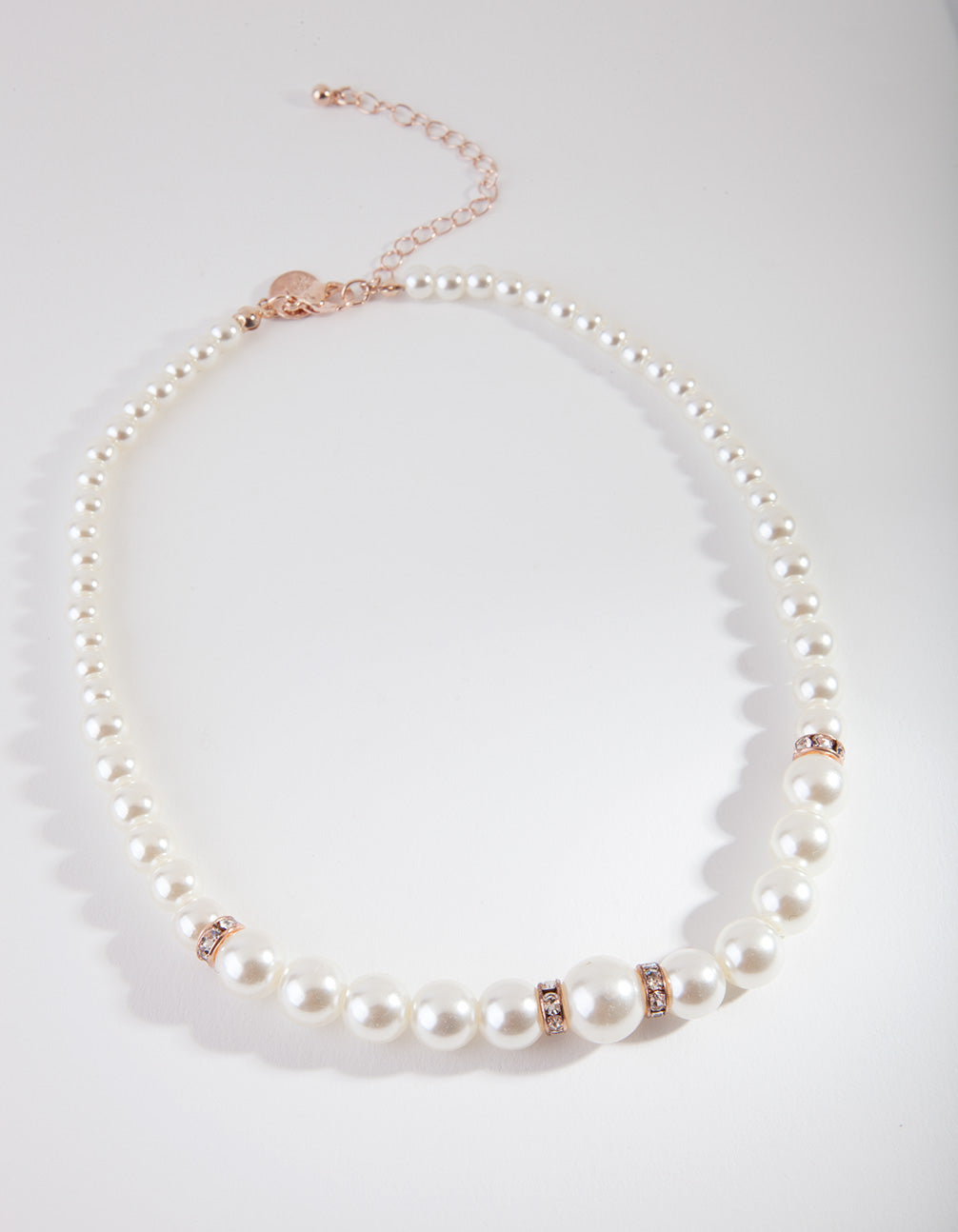 This is a pearl necklace featuring rose gold-tone diamante disc enhancements.