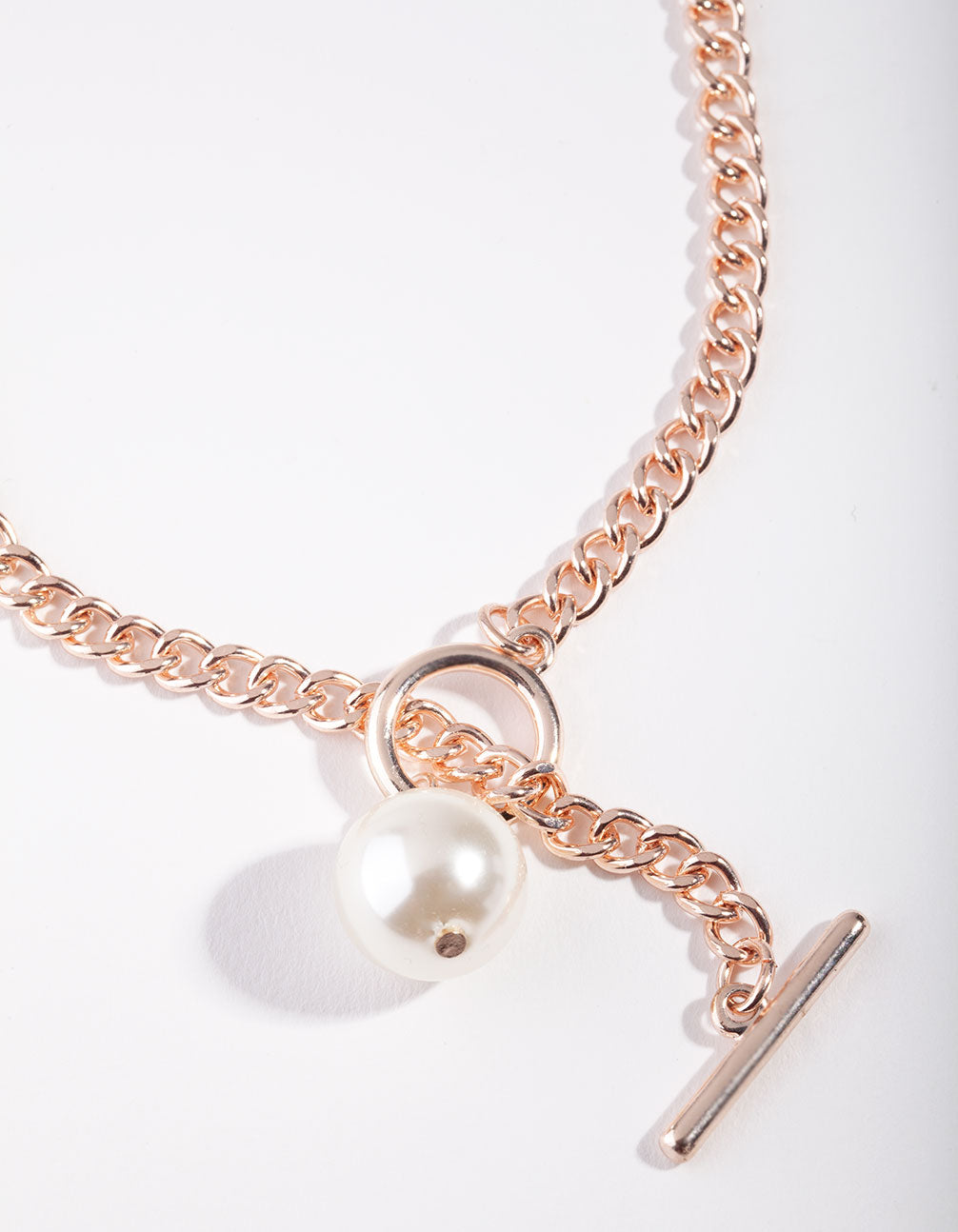 Add the finishing touch to your look with a classic chain necklace. This style comes in a rose gold tone with a faux pearl bead.