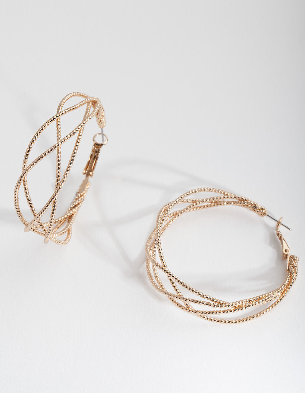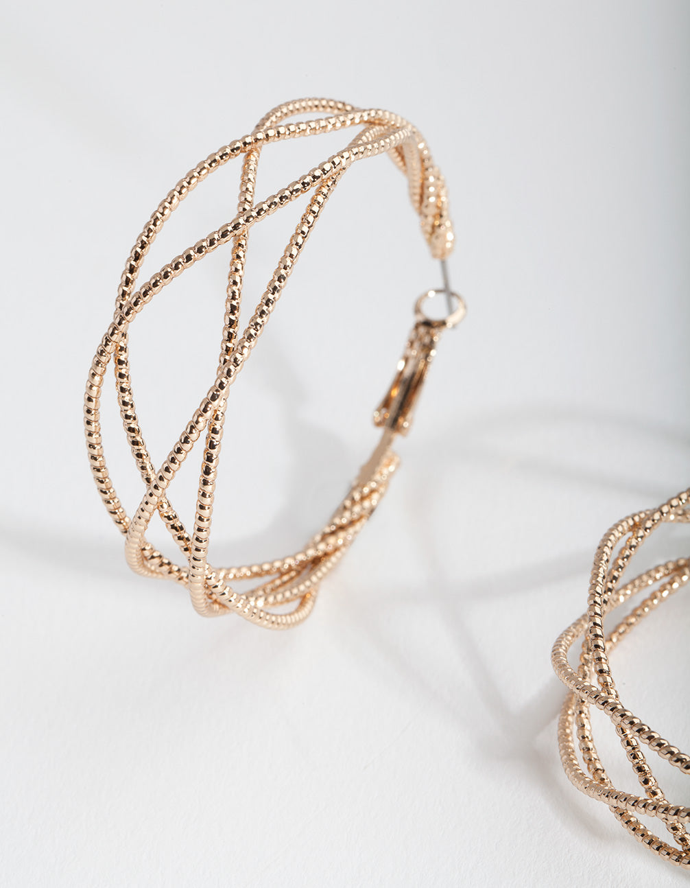 At Lovisa, we love a unique and intriguing design. This pair of gold-toned hoop earrings feature a textured criss-cross design. Elevate any look with this essential must-have earring set! !
