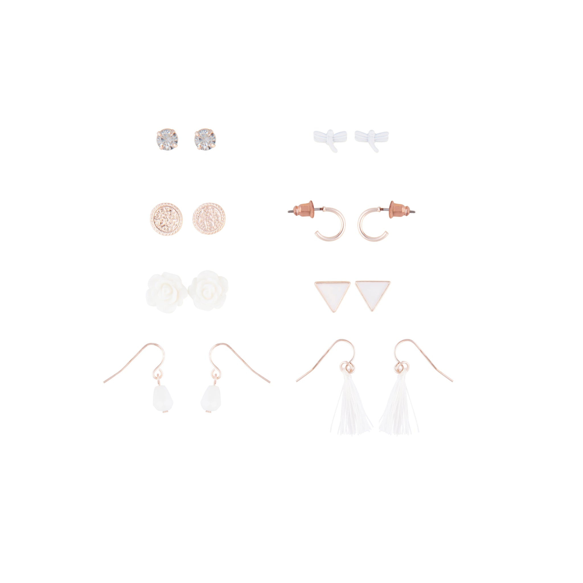 This rose-gold-toned pack of 8 earrings features a variety of designs including a rose-gold-toned drop earring with a white tassel.