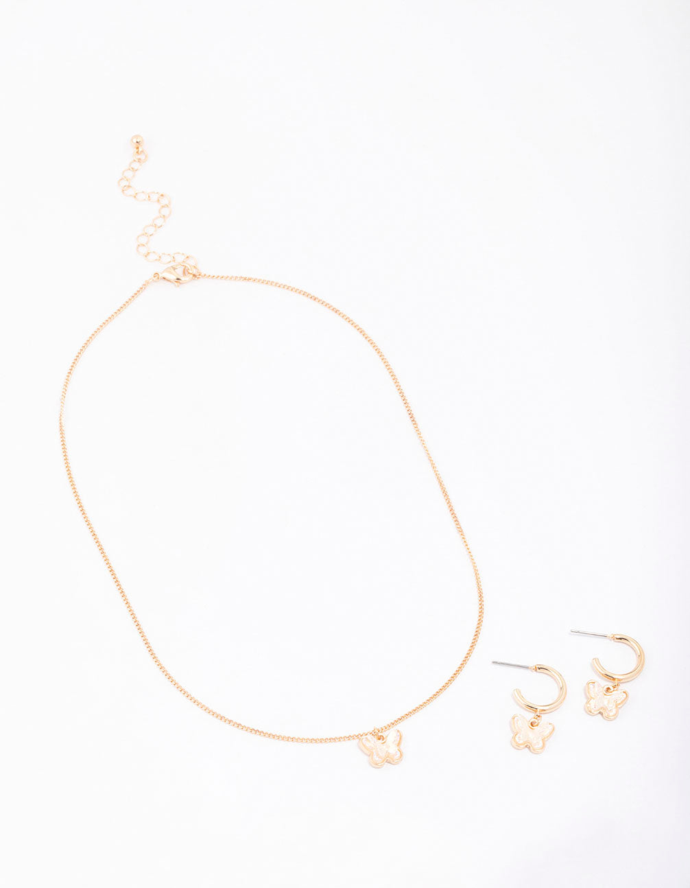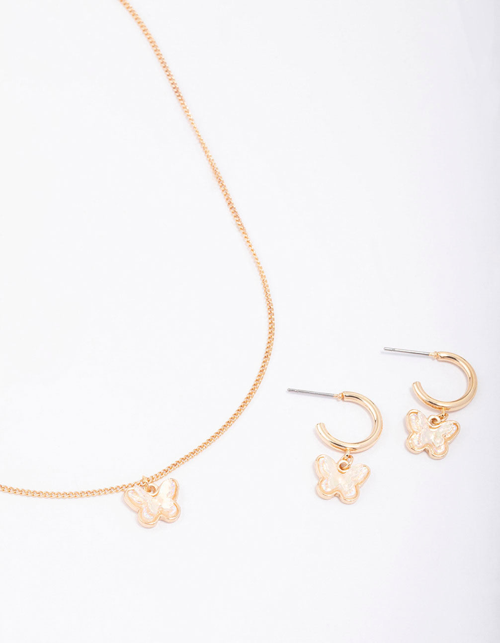 - Contents: This gift box contains a pair of butterfly drop earrings and matching pendant necklace.