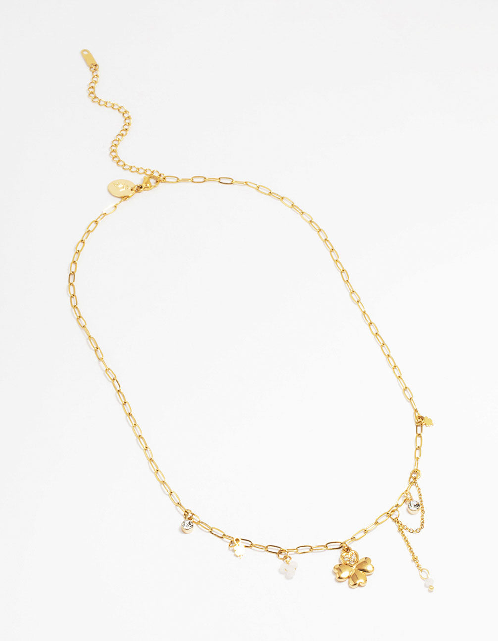 Meet the Waterproof Gold Plated Stainless Steel Clover Charm Necklace – your new go-to for effortless style and a bit of luck! With its sleek gold-plated finish and playful charms, including a dainty clover, this charm necklace is perfect for all occasions.