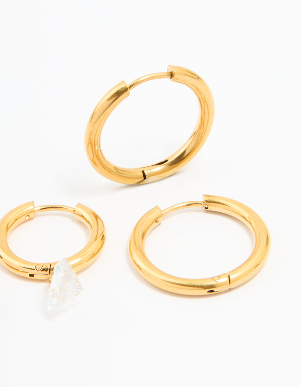 Waterproof Gold Plated Stainless Steel Cubic Zirconia Droplet & Sleek Hoop Earrings 2-Pack