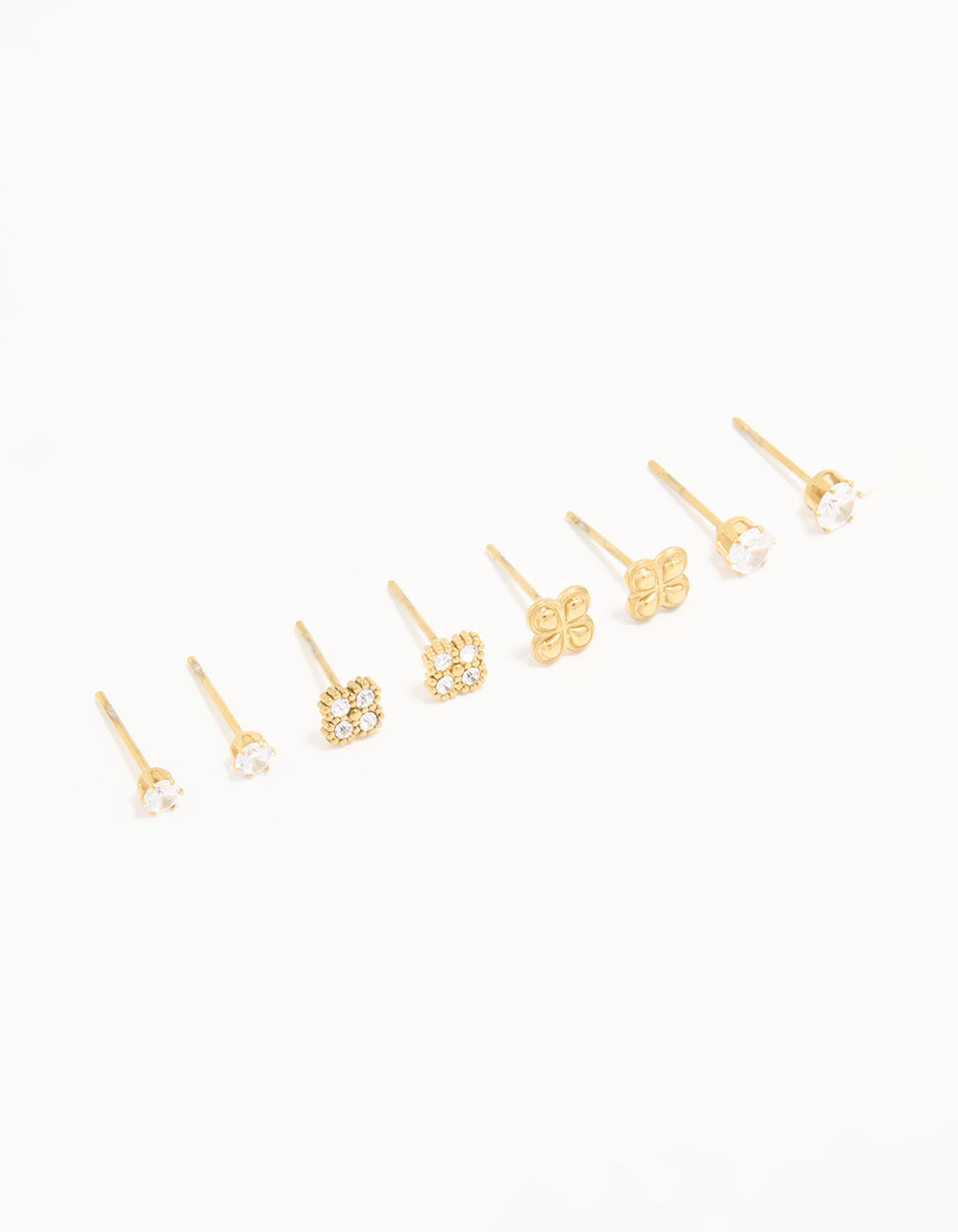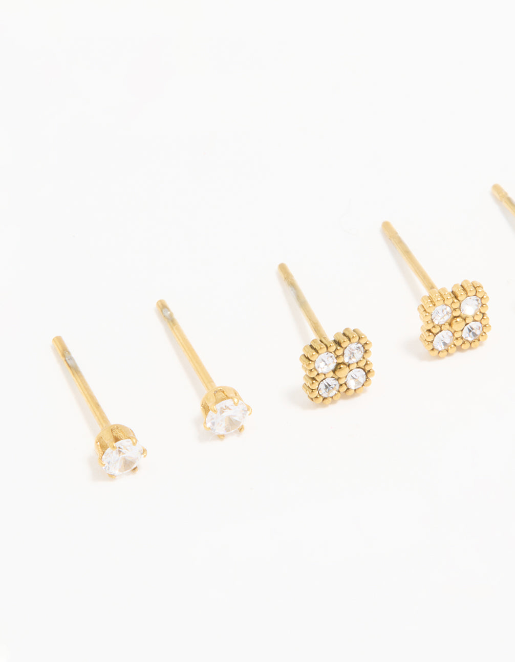 Waterproof Gold Plated Stainless Steel Cubic Zirconia Flower & Classic Stud Earrings 4-Pack