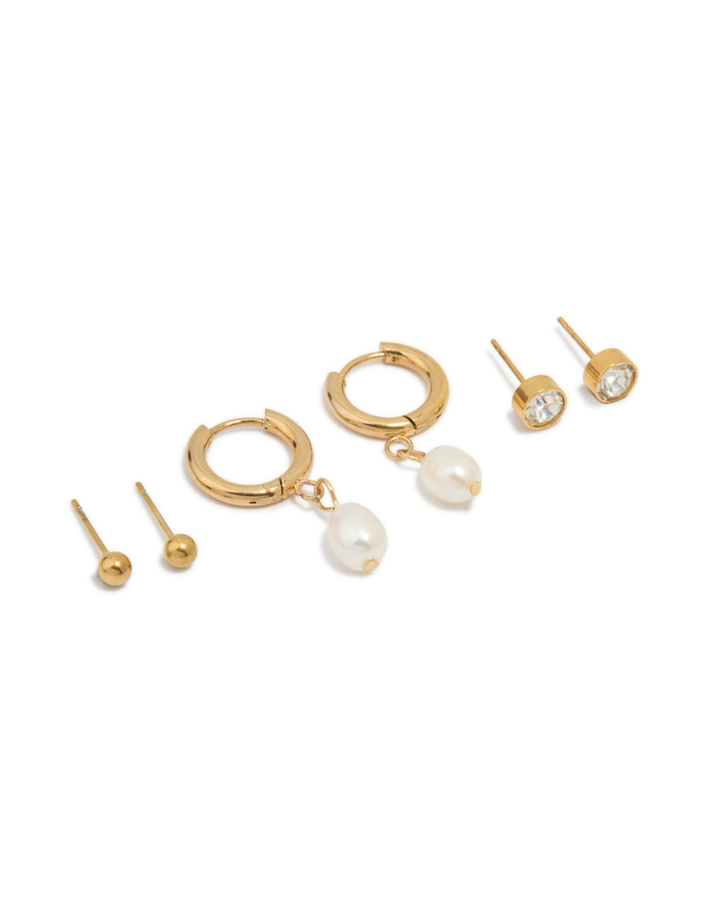 Waterproof Gold Plated Stainless Steel Freshwater Pearl Huggie & Stud Earrings 3-Pack