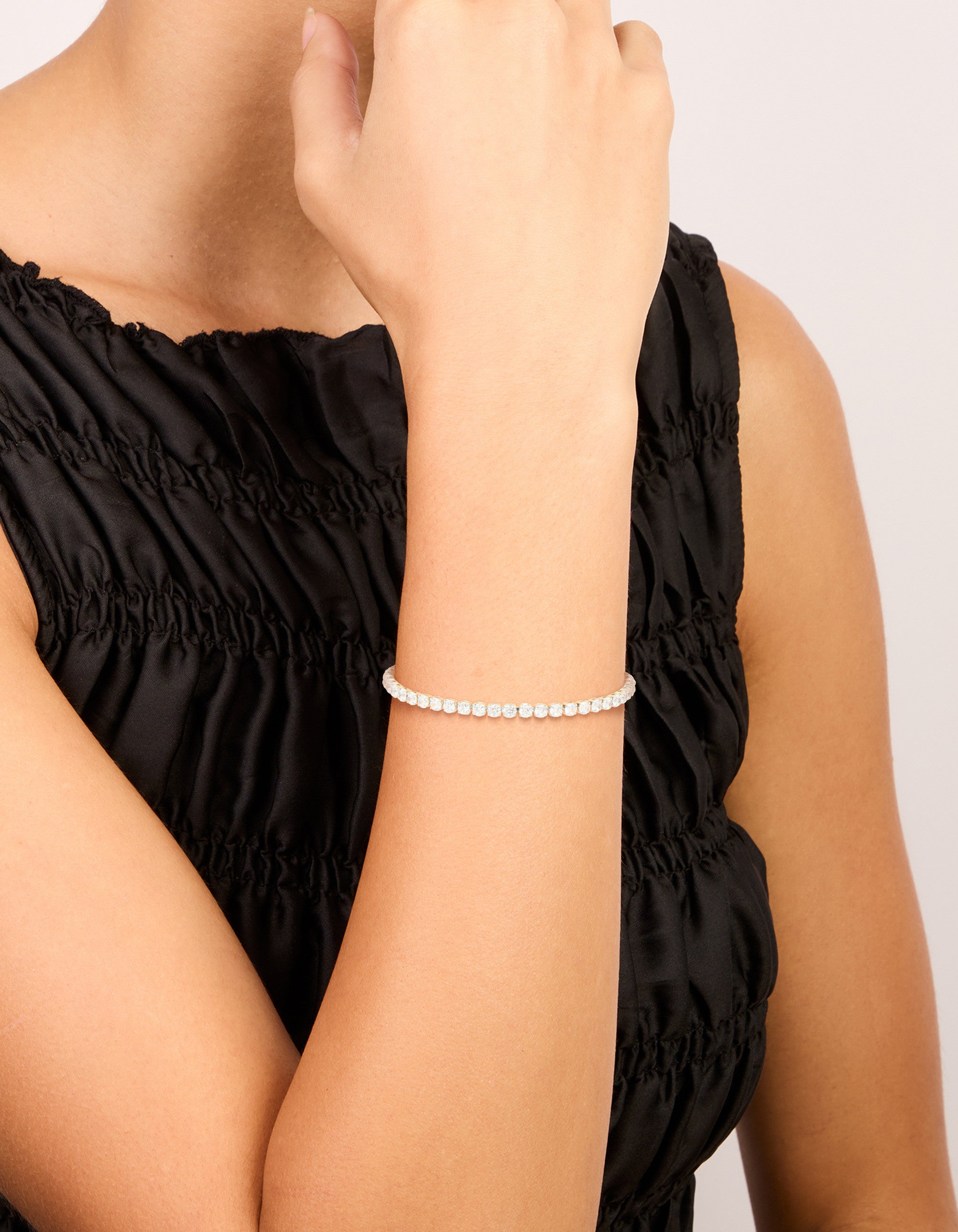 Elevate your everyday style with this Waterproof Stainless Steel Cubic Zirconia Tennis Bracelet. Crafted from durable stainless steel, this sleek bracelet shines with an elegant row of dazzling cubic zirconia crystals. Perfectly combining sophistication and practicality, it’s swim, sweat, and shower-proof, making it ideal for any occasion. Whether you're heading to a summer brunch, a beach day, or a glamorous evening out, this versatile bracelet is the perfect accessory. Pair it with a chic dress for a polished look or layer it with other bracelets for a cool, laid-back vibe. It's a must-have for anyone who loves timeless, easy-to-wear jewellery that shimmers all day long!